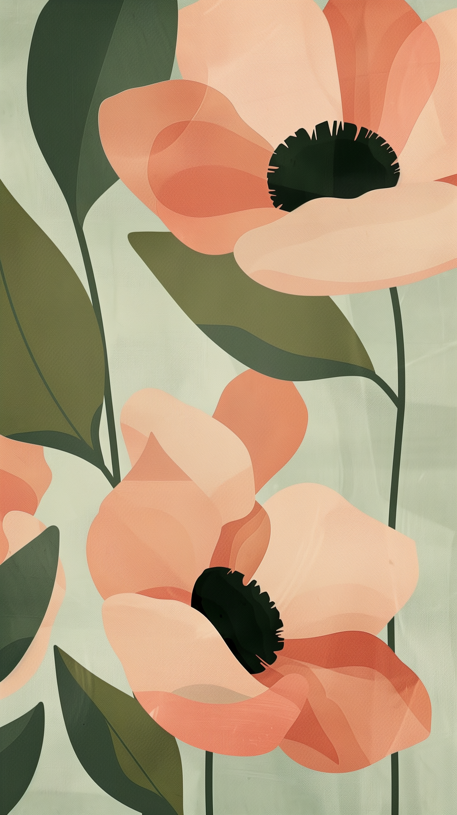 Stylized peach and coral flowers with green leaves on a muted green background, creating a modern and minimalistic floral illustration.