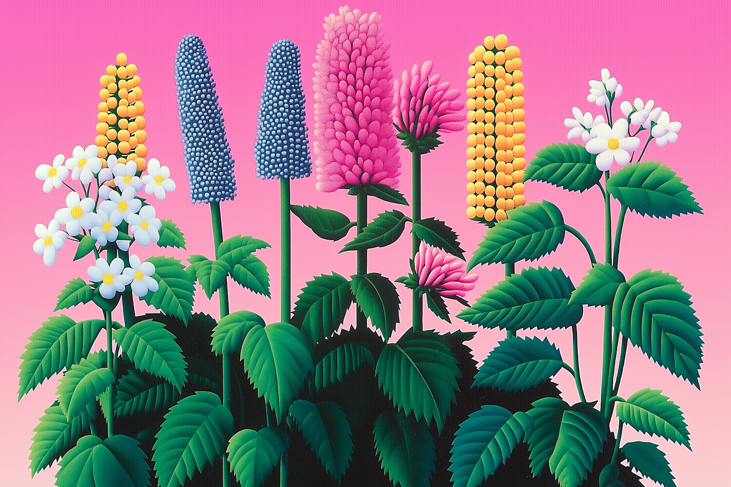 Colorful stylized flowers with bulbous shapes against a pink gradient background, featuring white, blue, pink, and yellow hues.