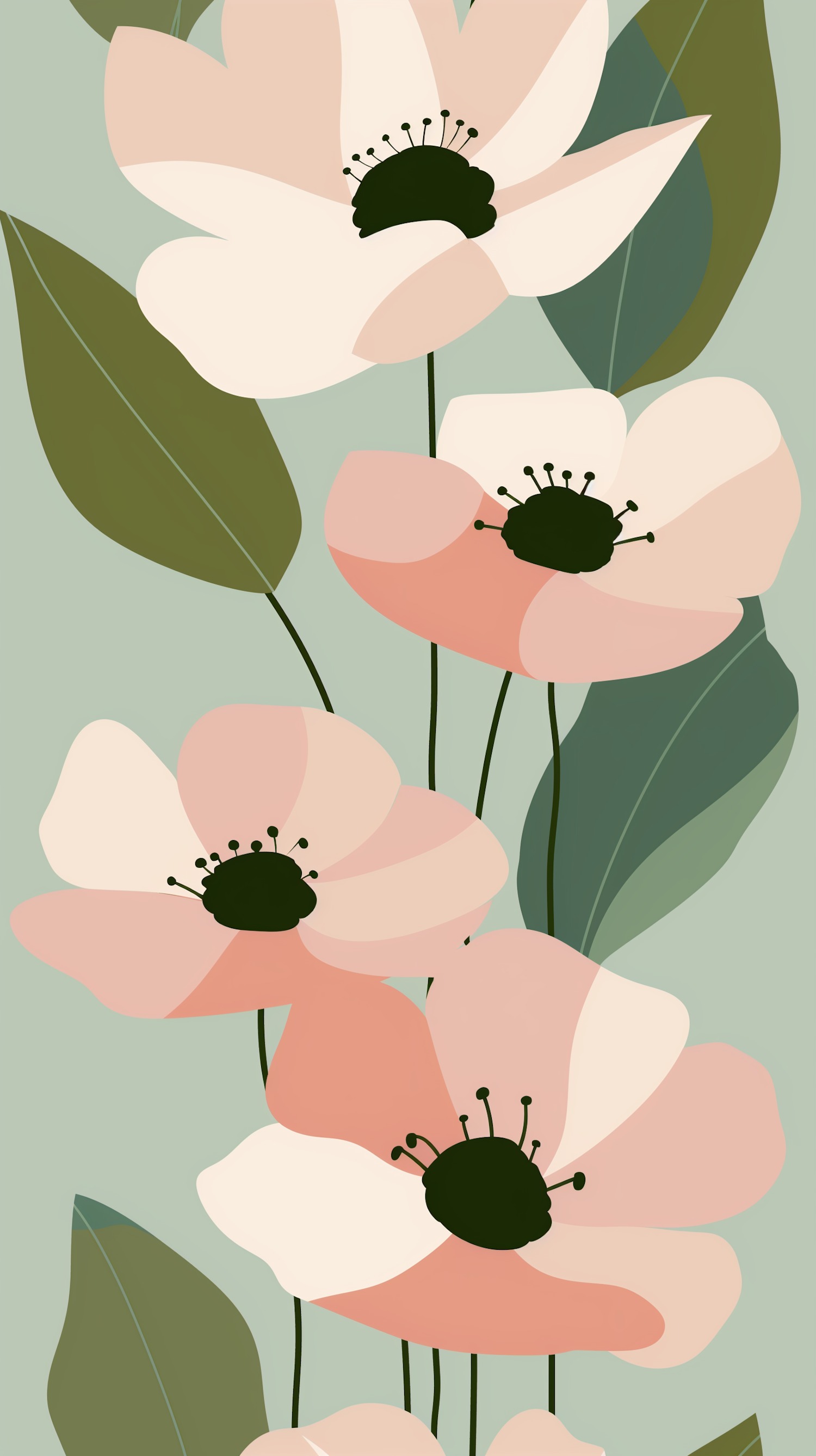 Minimalist floral illustration with pastel petals, green leaves, and muted tones, perfect for modern decor or nature-inspired designs.