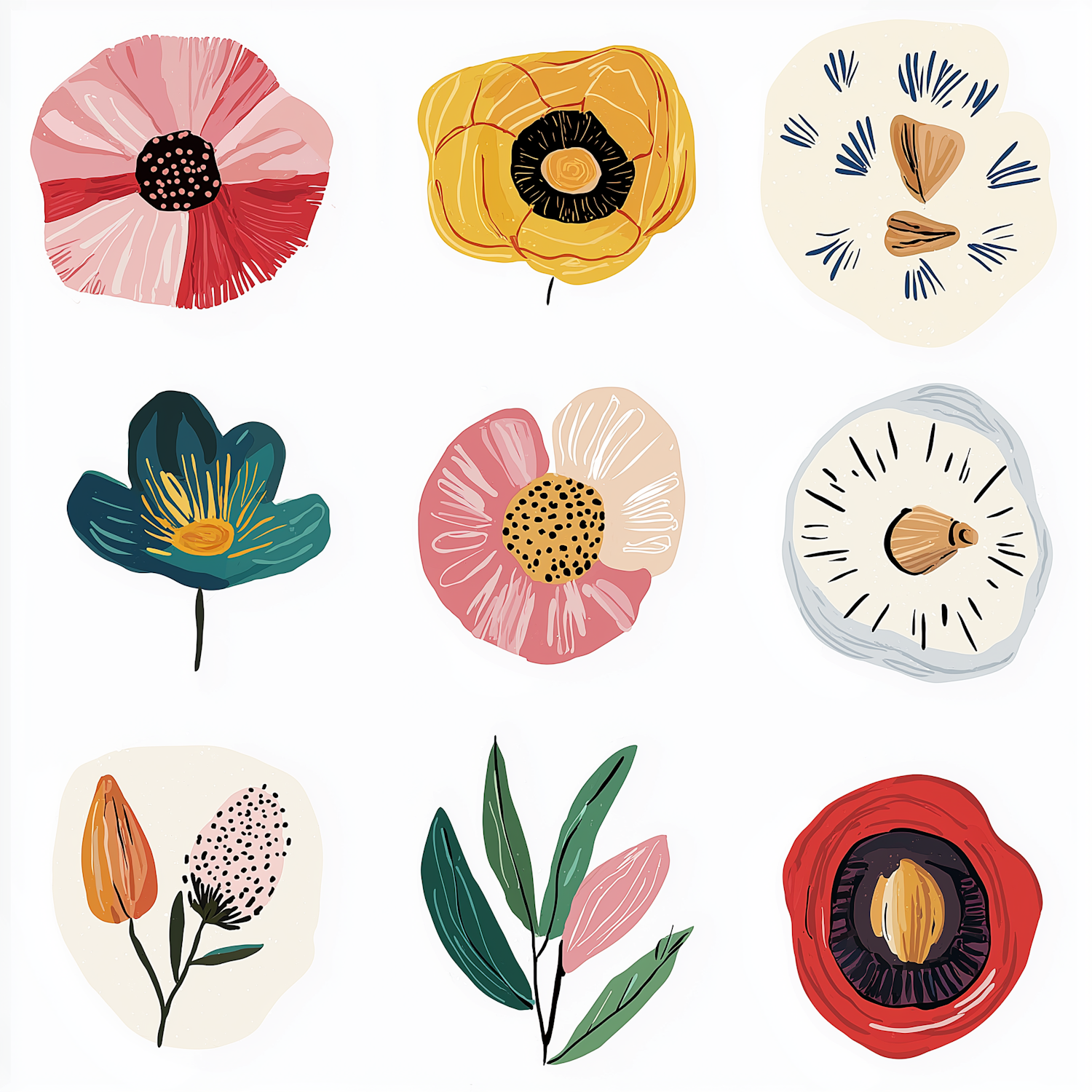 Bright and playful floral illustrations in a grid, featuring unique designs in pink, yellow, teal, and red on a clean white background.