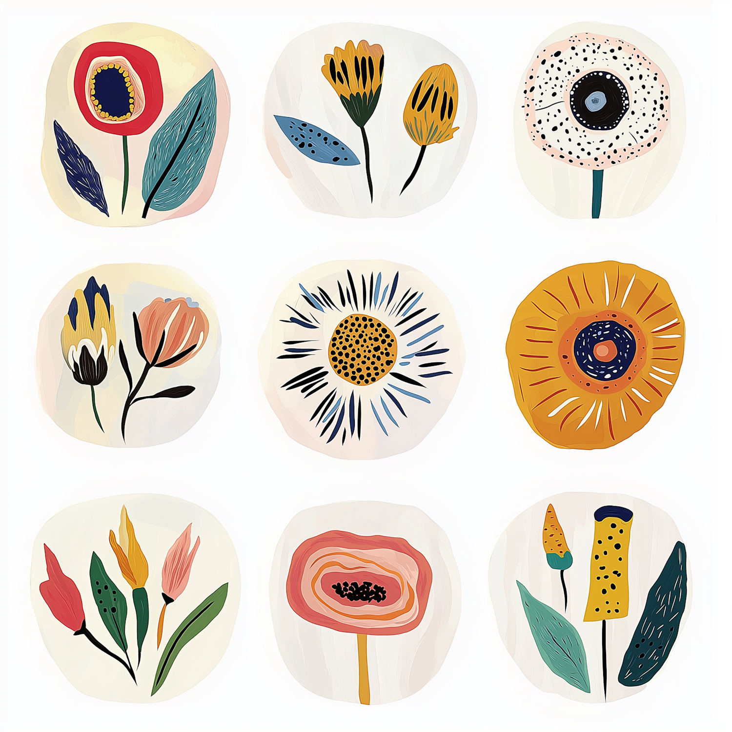 Bright and modern floral illustration with nine unique abstract flowers in bold colors and soft pastel backgrounds.