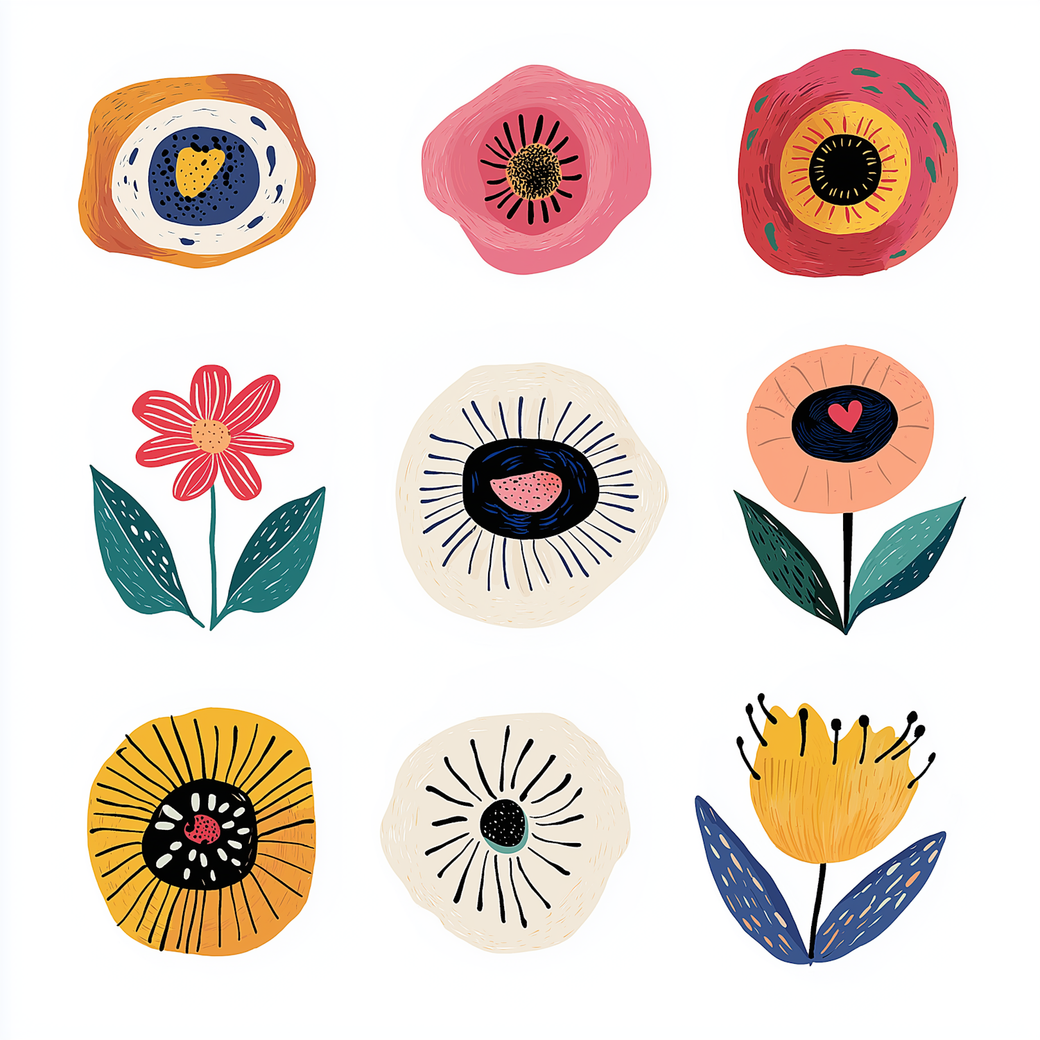 Playful floral illustration with nine unique, colorful flowers in a grid. Perfect for creative projects or cheerful decor.