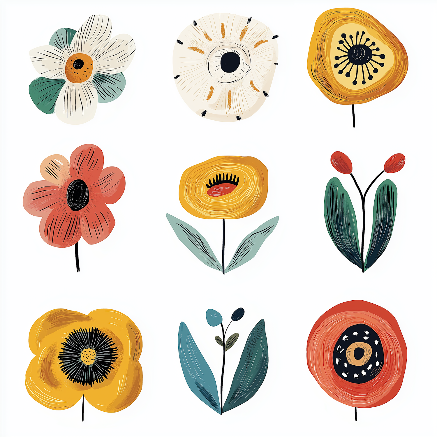 A vibrant grid of nine hand-drawn floral illustrations in warm yellows, reds, and greens, perfect for modern decor or design inspiration.