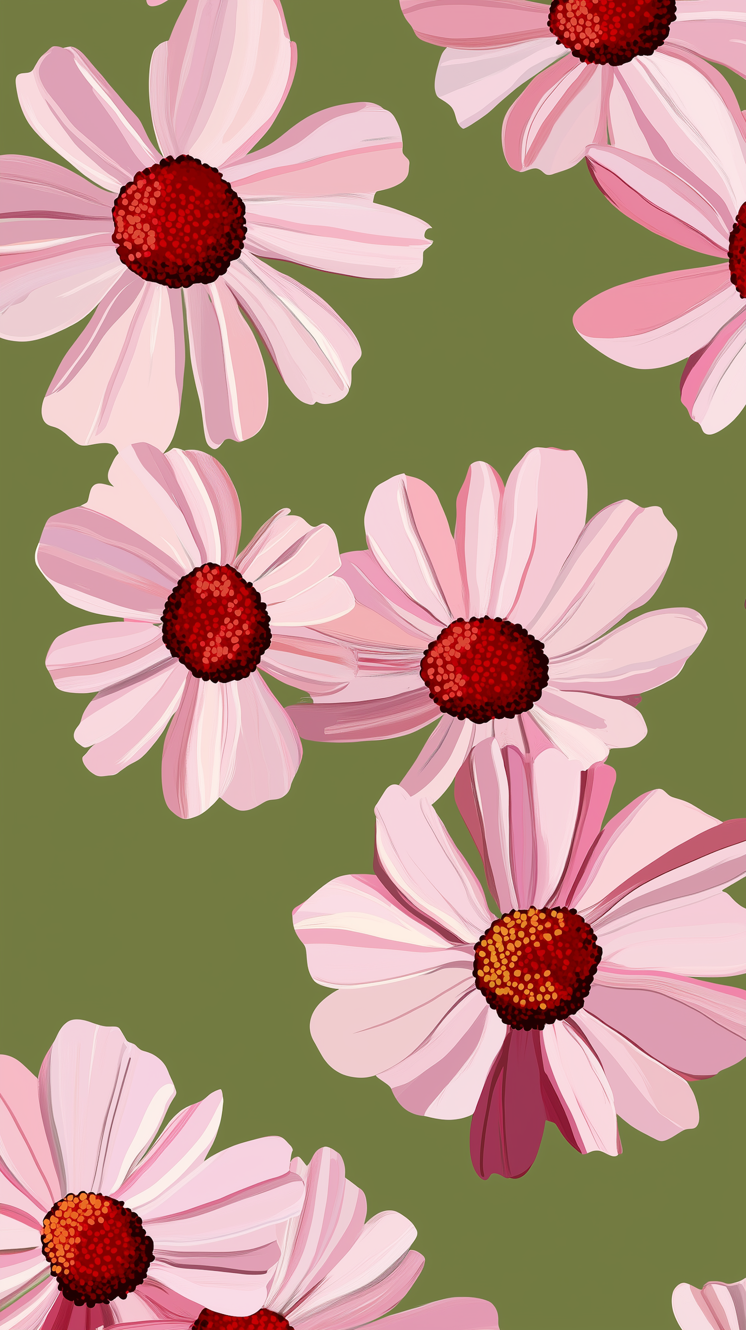 Illustration of pink flowers with red centers on a green background, creating a vibrant and dynamic floral pattern.