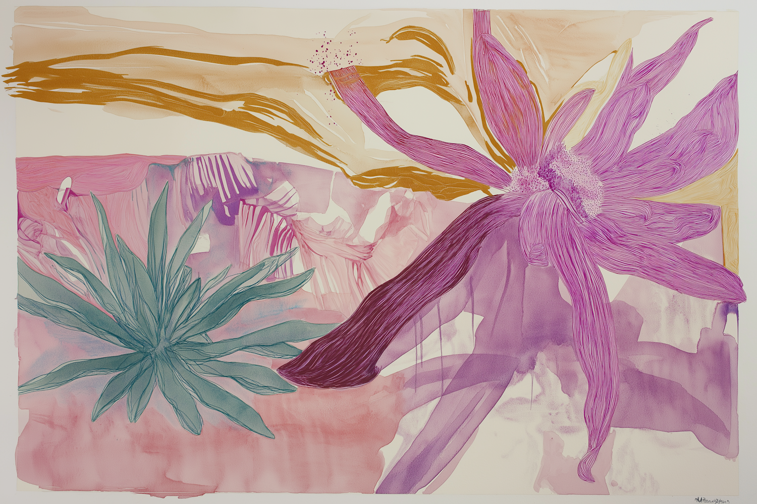 Abstract floral illustration with vibrant purple and green plants, set against a pink and golden background.