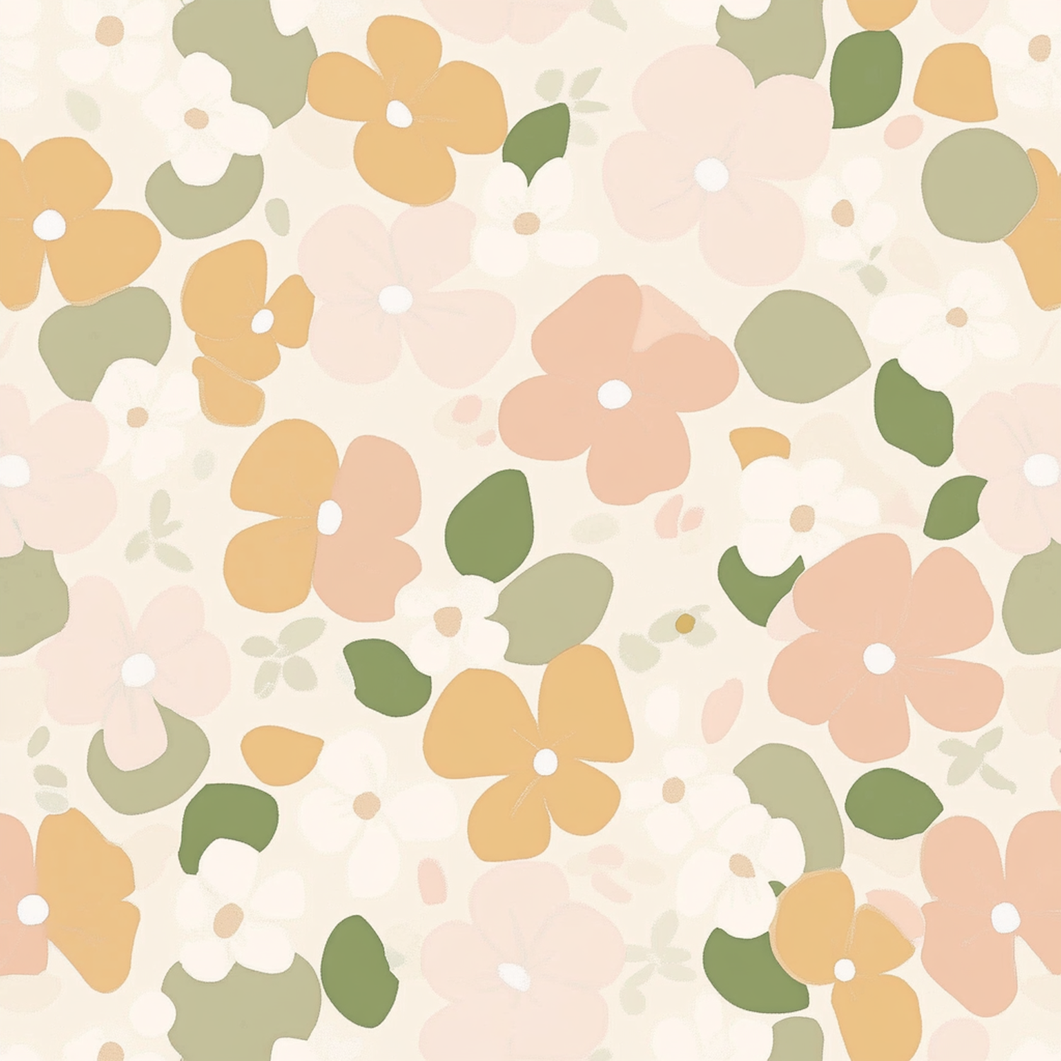 Seamless floral pattern with pastel flowers and green leaves on a cream background, perfect for textiles or wallpapers.