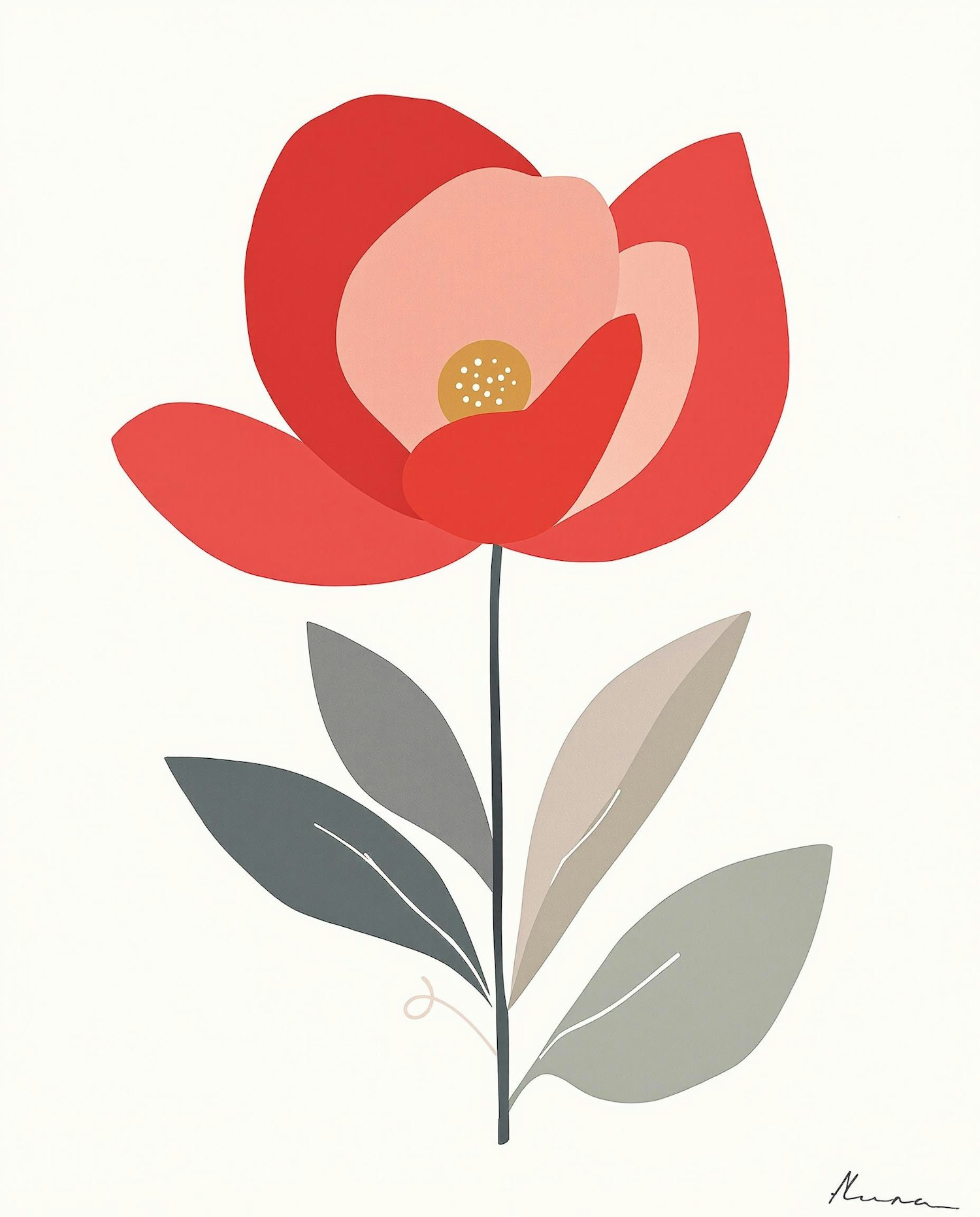 Minimalist artwork featuring a vibrant red flower with soft-toned leaves on a bright white background, showcasing artistic simplicity.
