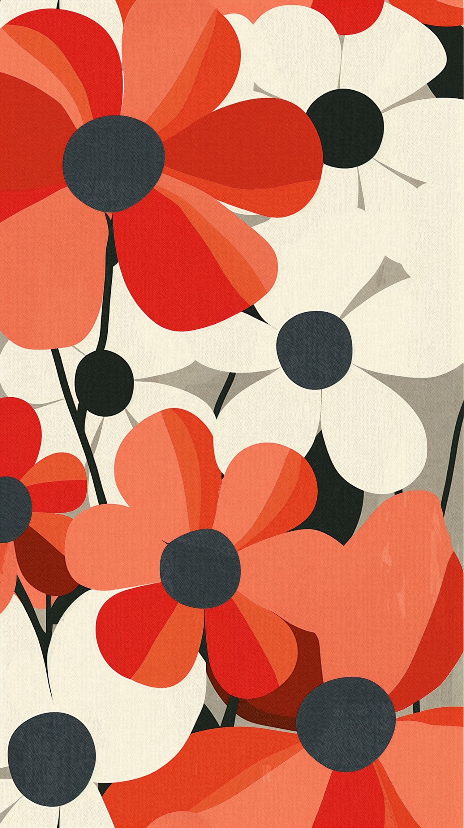 Bright and bold floral illustration with red, orange, and white flowers featuring dark circular centers in a modern, graphic style.