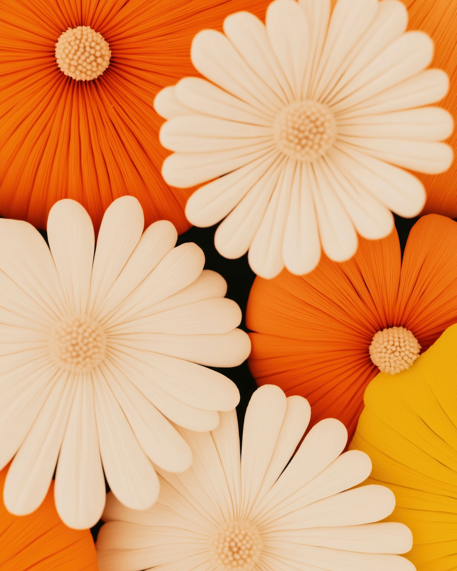 Close-up of cream, orange, and yellow stylized flowers with textured petals and intricate centers in a vibrant, overlapping arrangement.