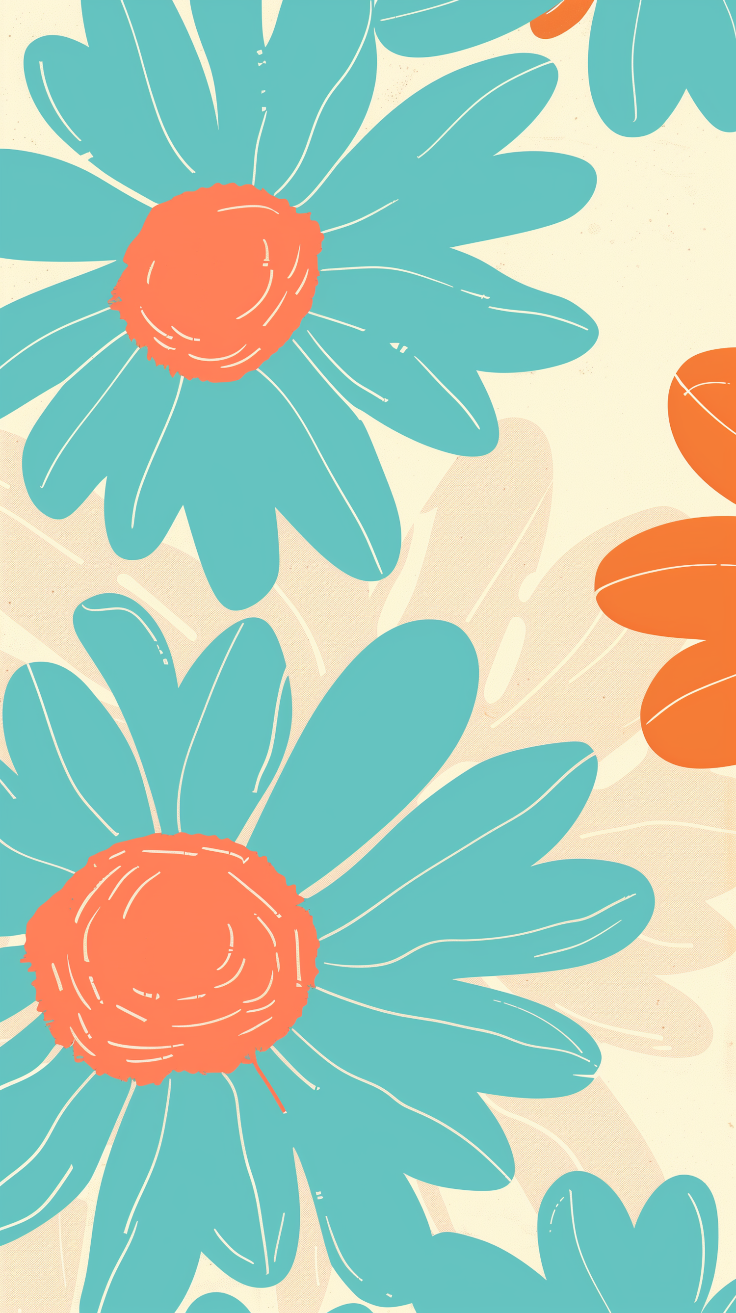 Bright turquoise flowers with orange centers on a beige textured background, creating a playful and retro-inspired floral illustration.