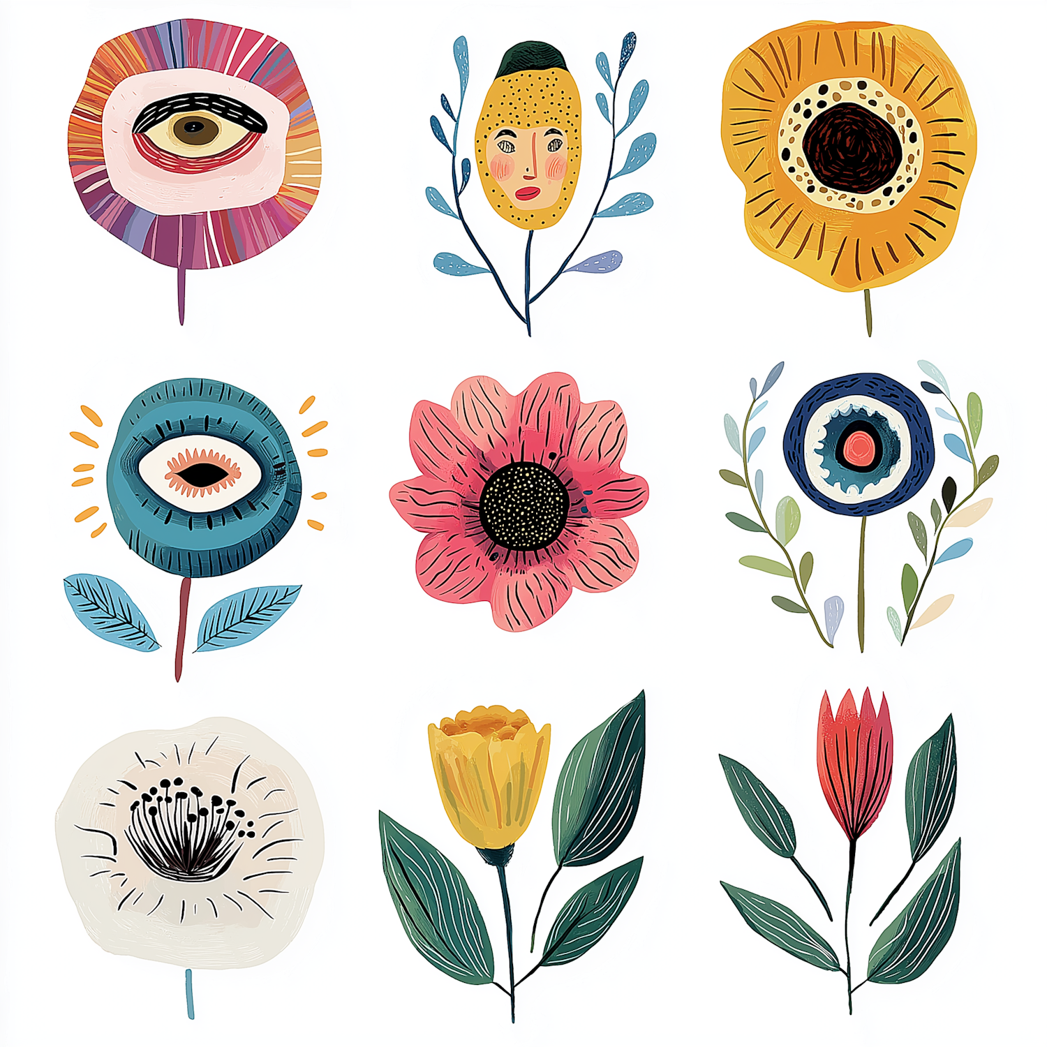Whimsical floral illustration with bold colors, surreal designs, and playful details. Perfect for creative and artistic inspiration.