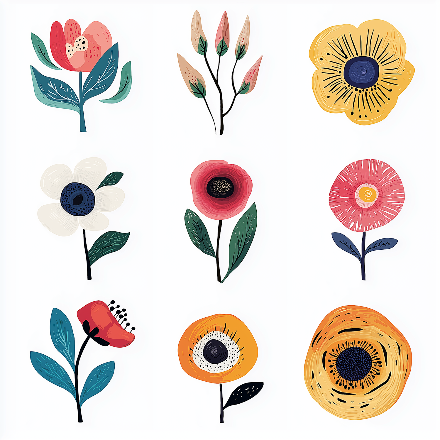 Bright and artistic floral illustrations in a 3x3 grid, featuring unique designs and bold colors on a clean white background.
