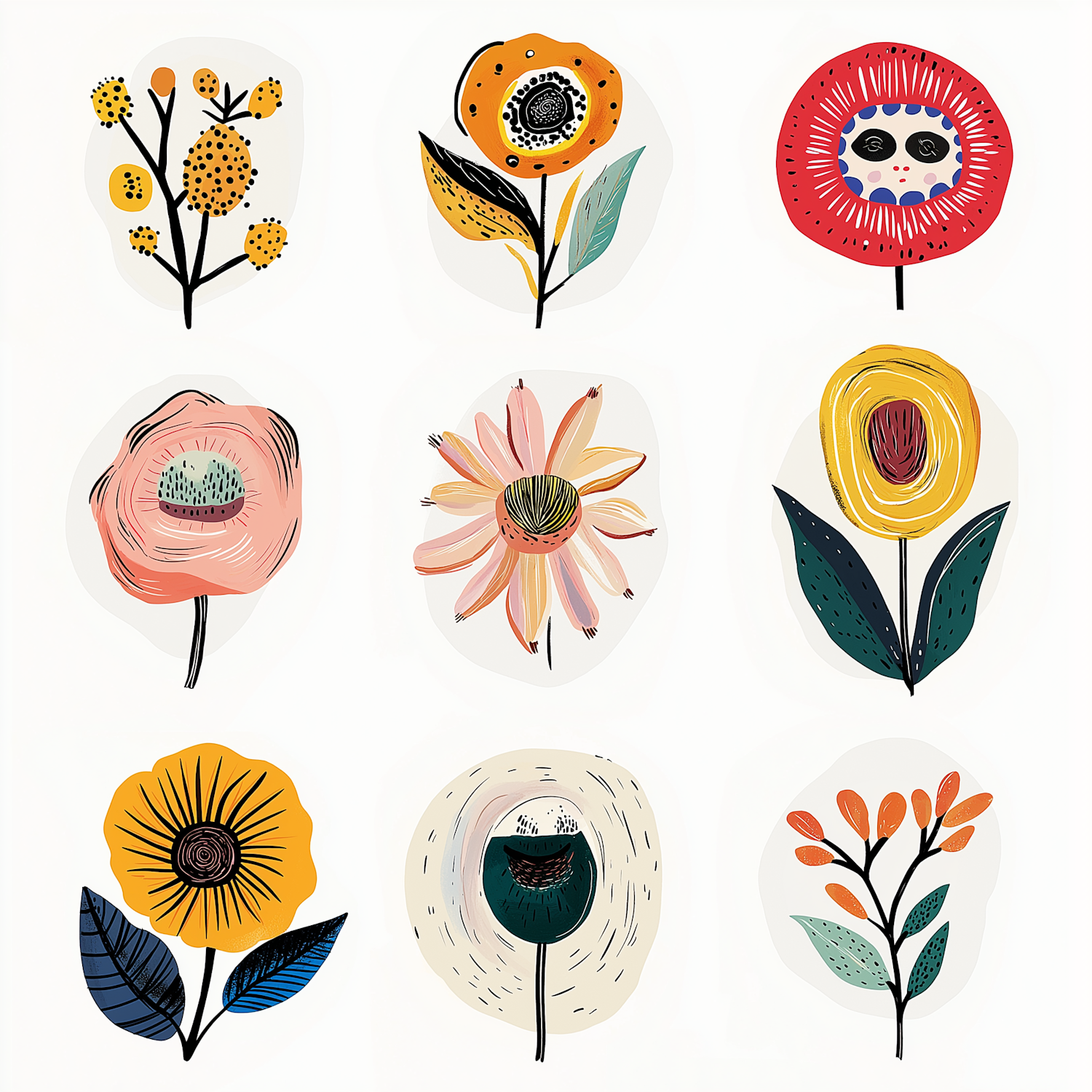Whimsical floral illustration with nine unique, colorful flowers in a grid. Perfect for nature-inspired designs and creative projects.