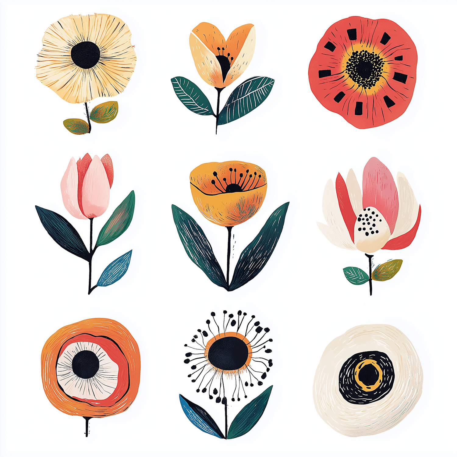 Bright and bold floral illustration with nine unique flowers in a grid, featuring vibrant colors and intricate details on a white background.
