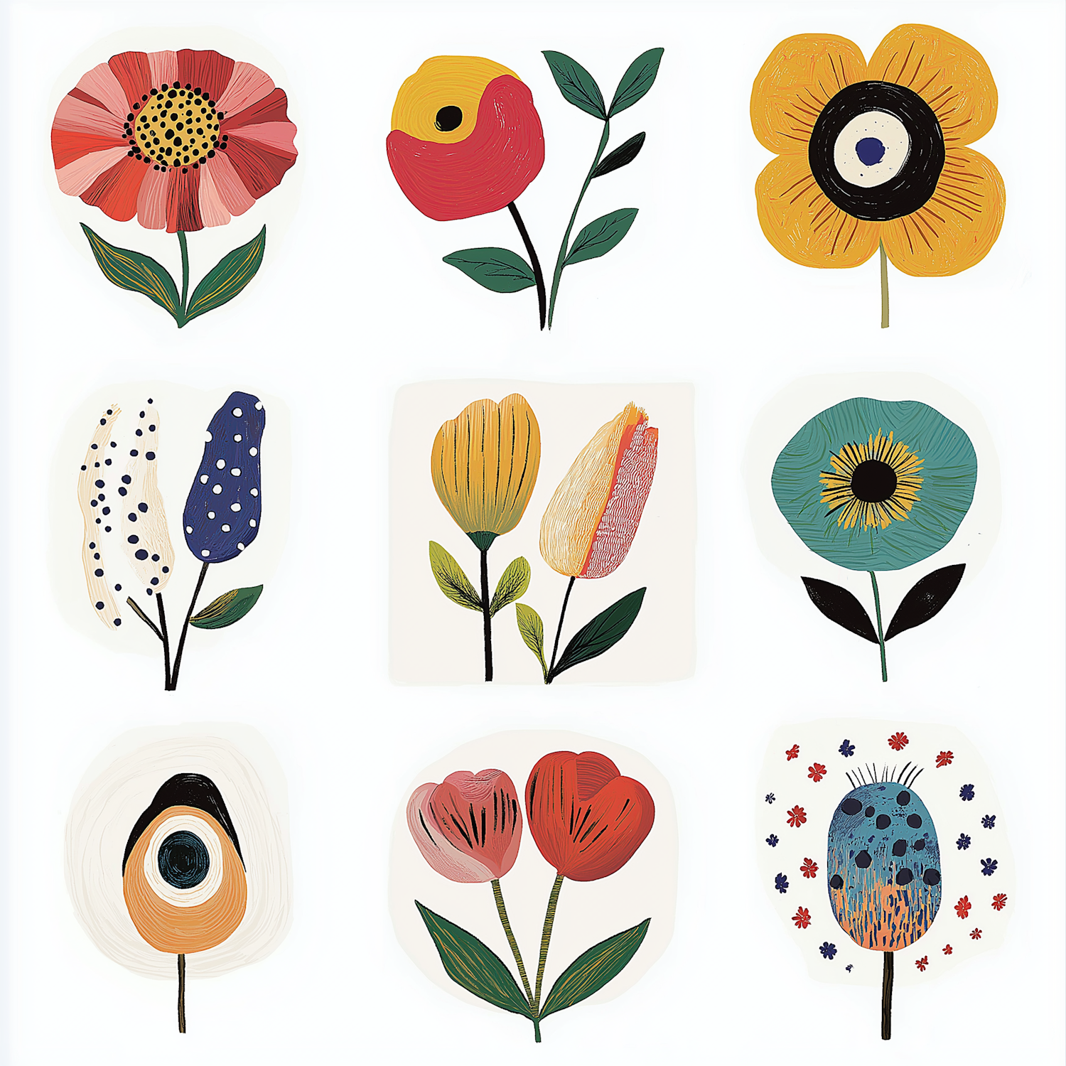 Bright and playful floral illustration with nine unique, colorful flowers in a grid. Perfect for art lovers and nature enthusiasts!