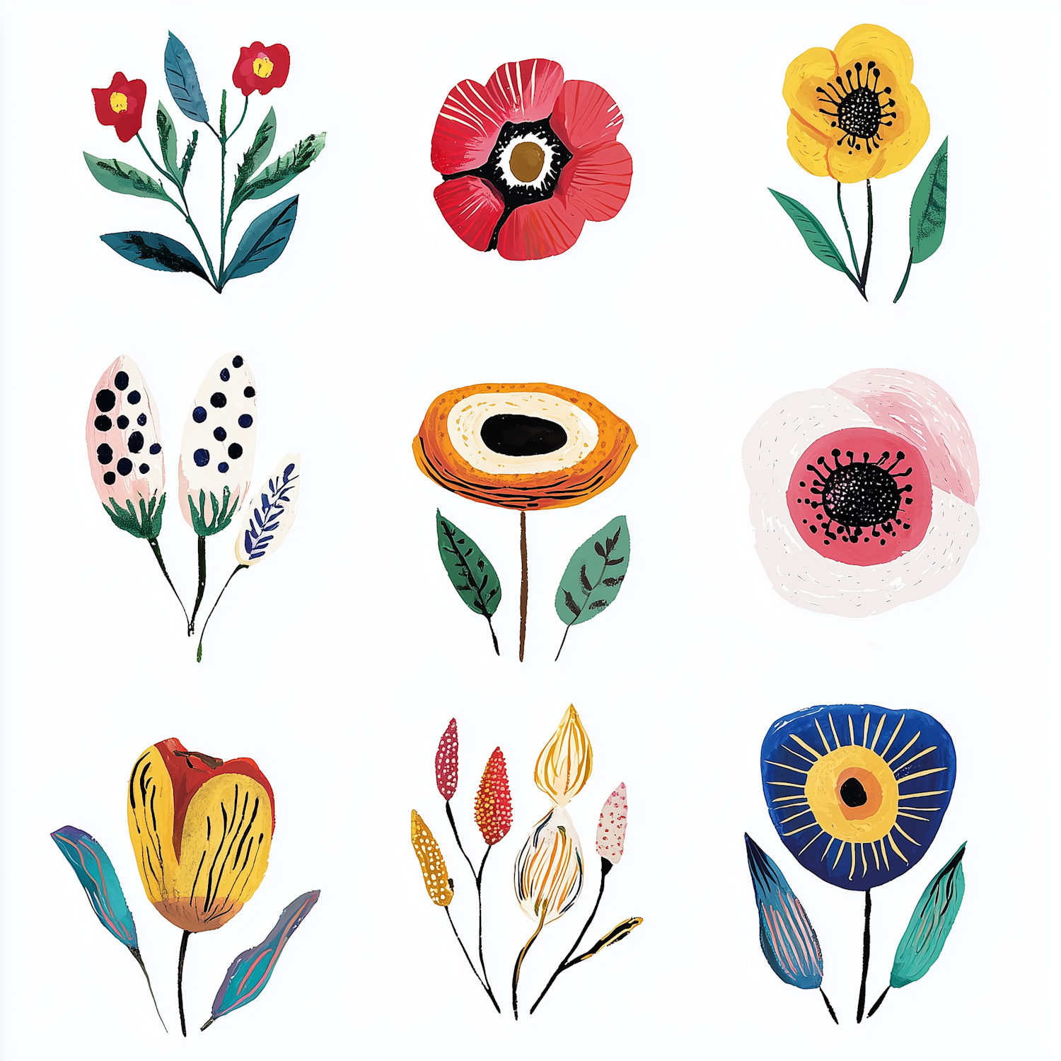 Bright and artistic floral illustration with nine unique flowers in bold colors and patterns, arranged in a clean 3x3 grid.