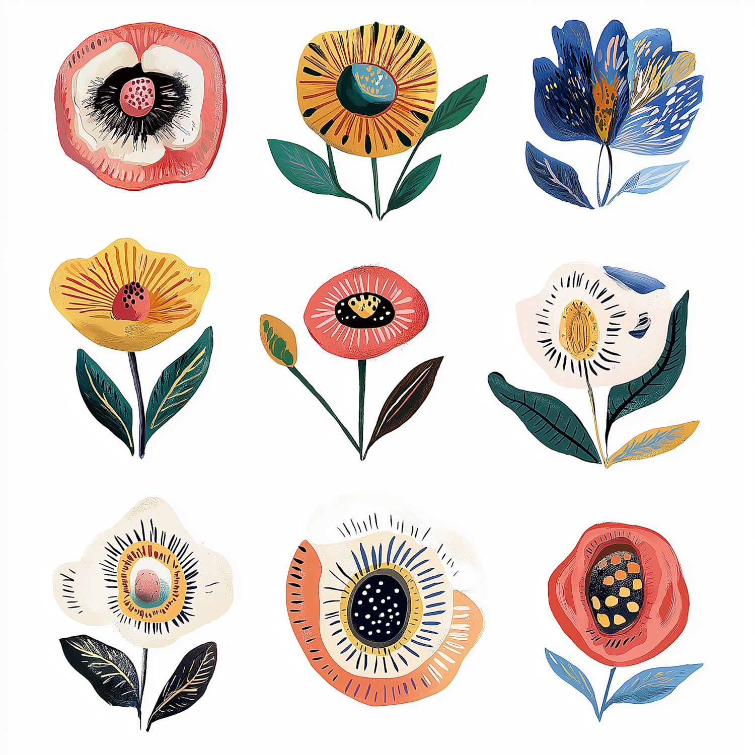 Bright and playful floral illustration with nine unique flowers in bold colors and patterns, perfect for modern decor or design inspiration.
