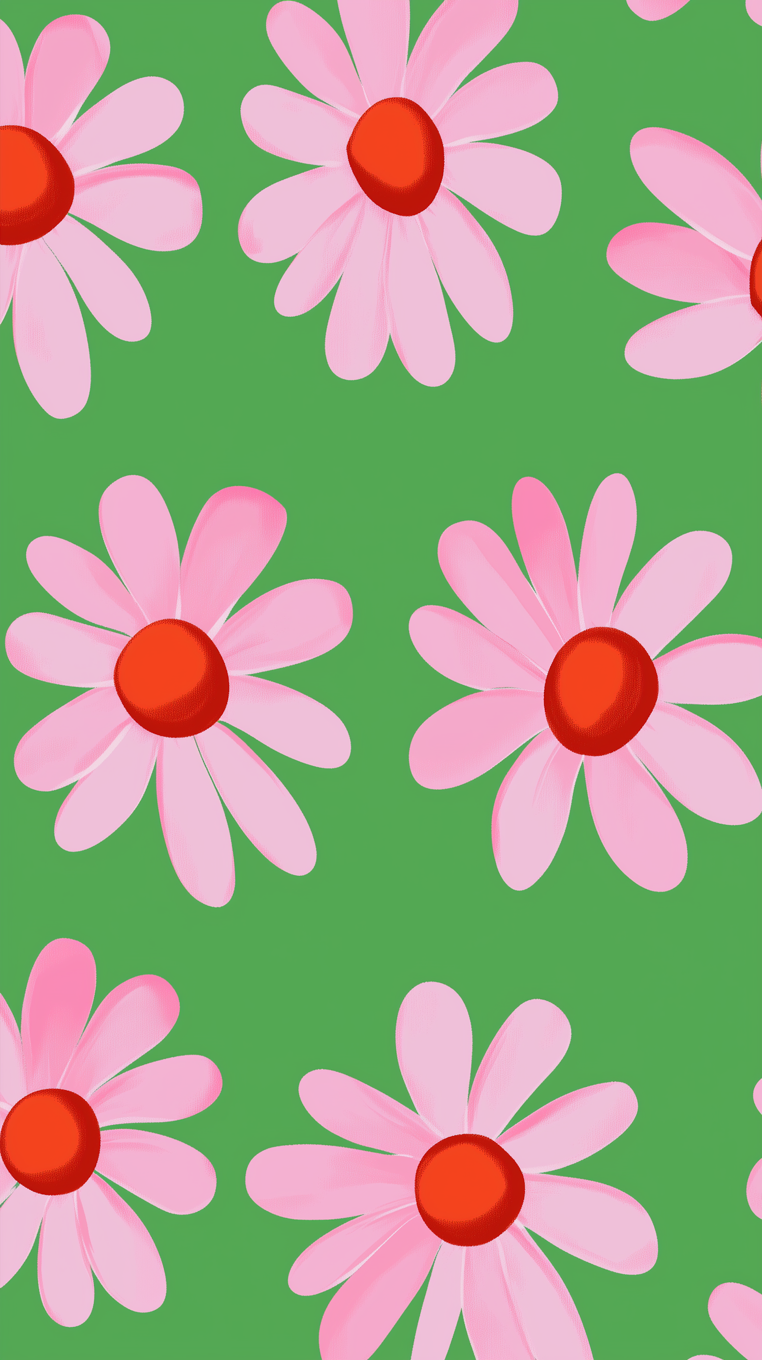 Bright floral pattern with pink daisies and red centers on a green background, perfect for cheerful and summery designs.