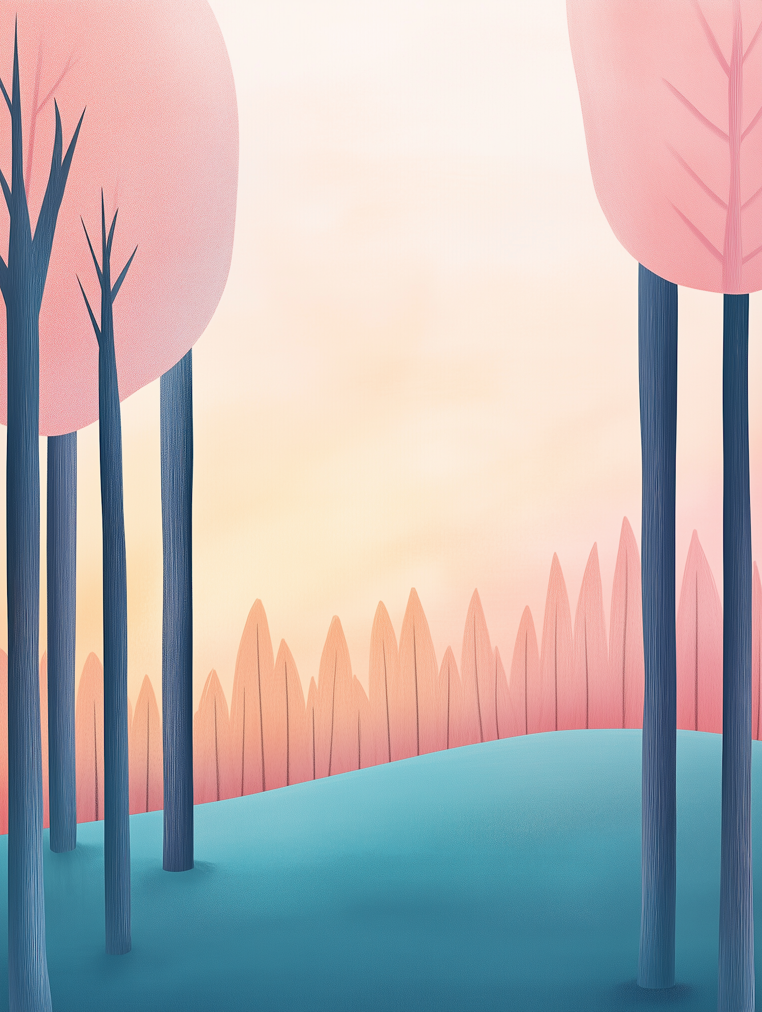 Minimalist forest illustration with blue tree trunks, pink canopies, and a pastel gradient sky. Perfect for serene and dreamy vibes.