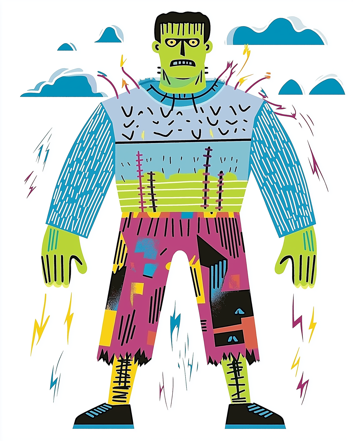 Colorful cartoon of a Frankenstein-like monster with patchwork clothes and lightning bolts, set against a whimsical cloud background.