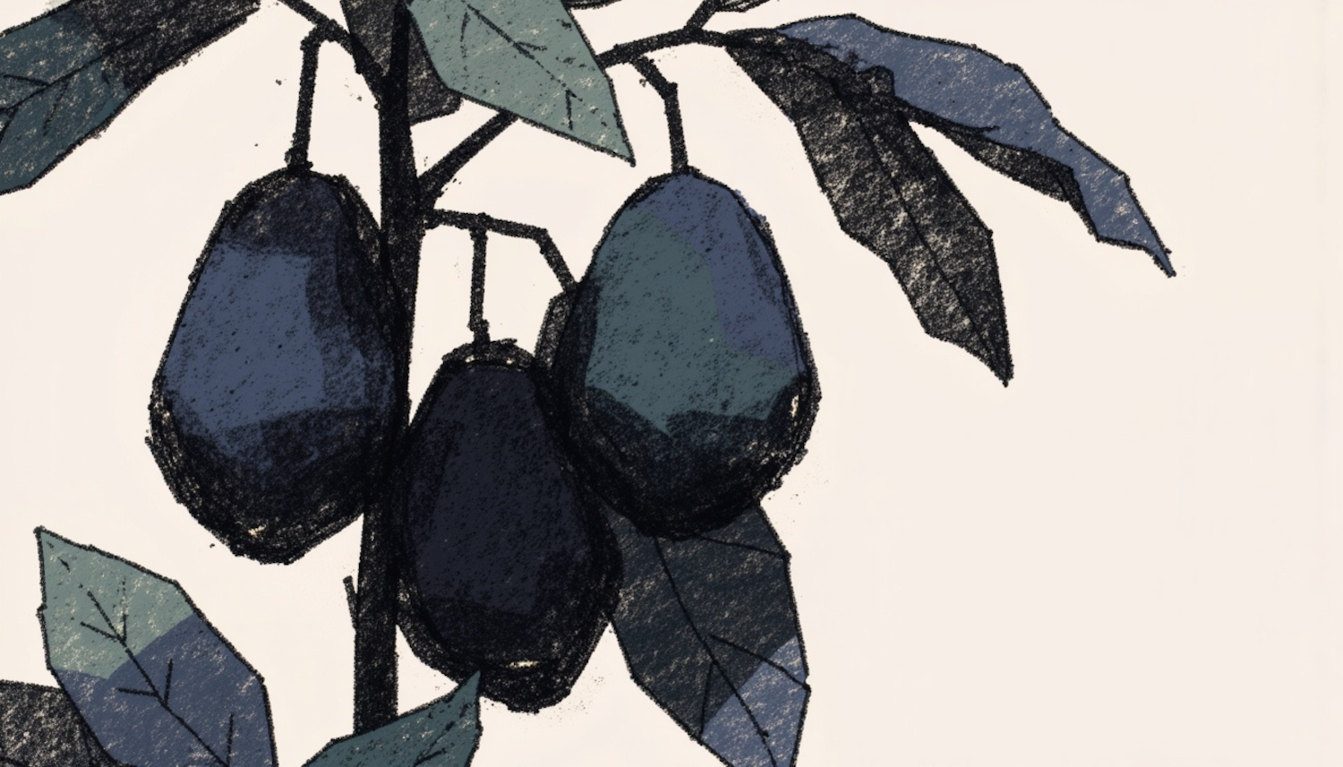 Artistic illustration of a branch with three dark purple fruits and green leaves, drawn in a textured, hand-drawn style on a beige background.