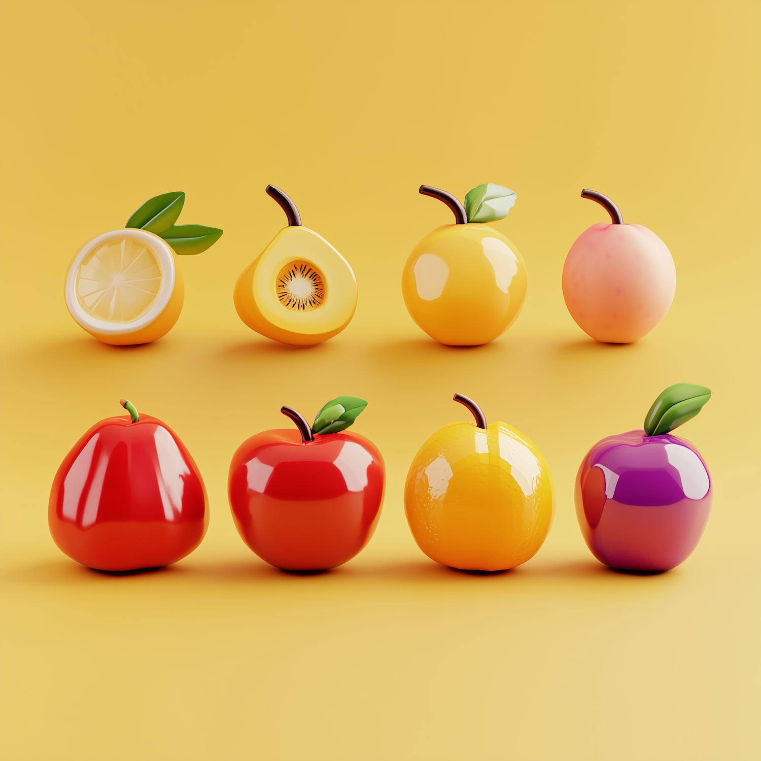 Glossy, stylized fruits in vibrant colors on a yellow background. Includes apples, lemon, kiwi, pear, peach, and more in a playful arrangement.