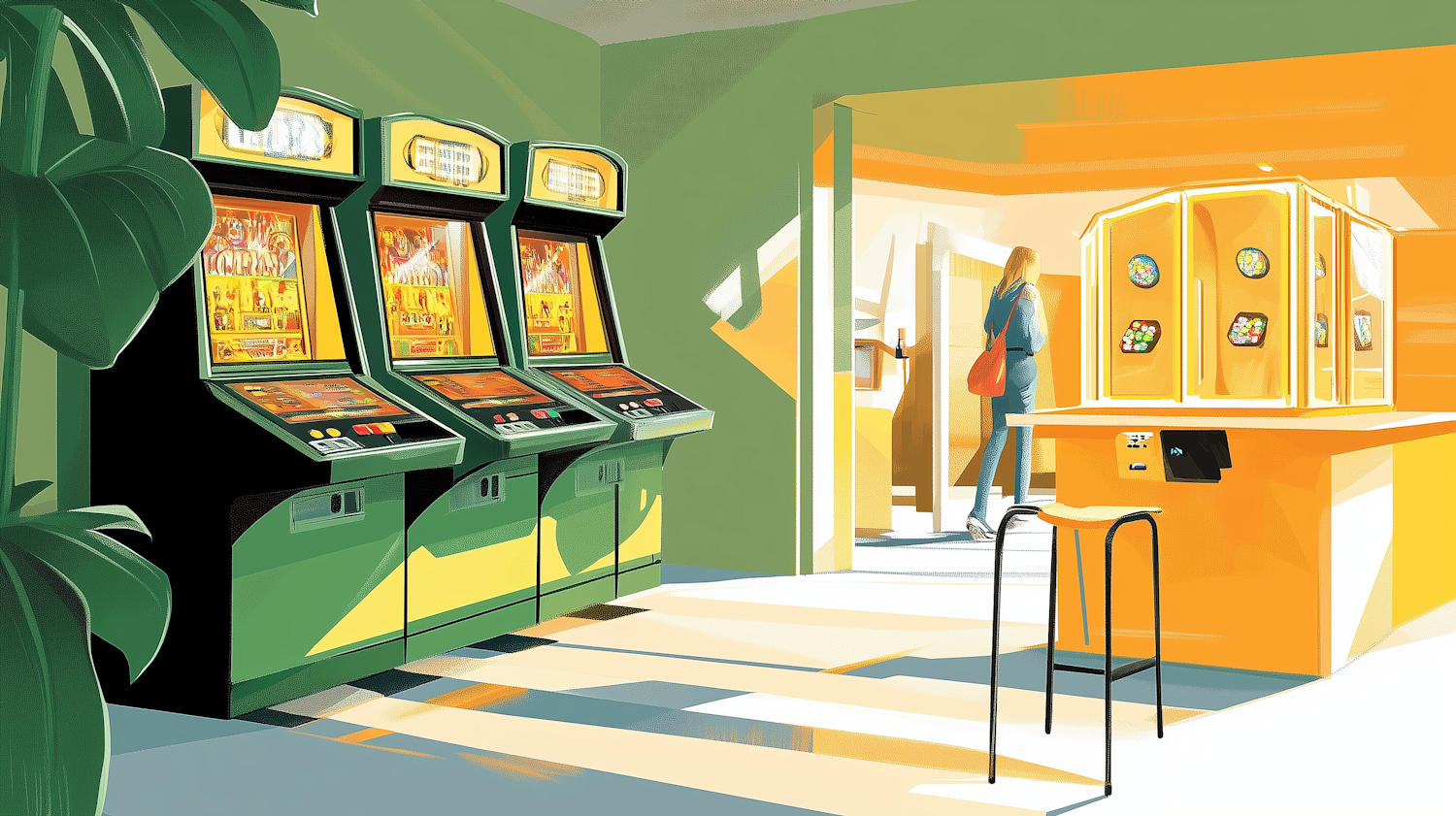 Vibrant arcade scene with glowing slot machines, a blonde woman in blue, and dynamic light play. Retro-modern vibe with warm colors.