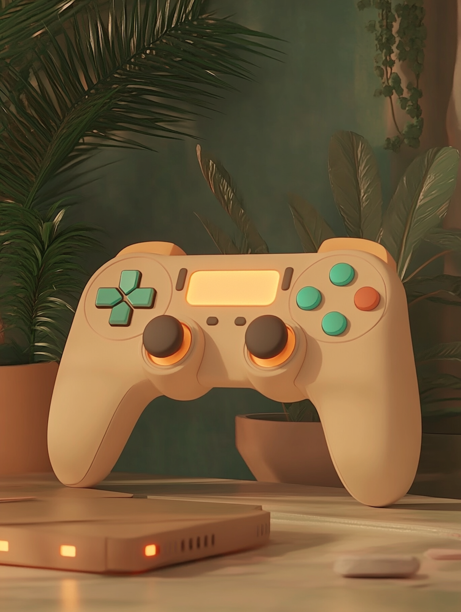 Stylized gaming setup with a beige controller, glowing accents, and lush plants in the background for a cozy, modern vibe.