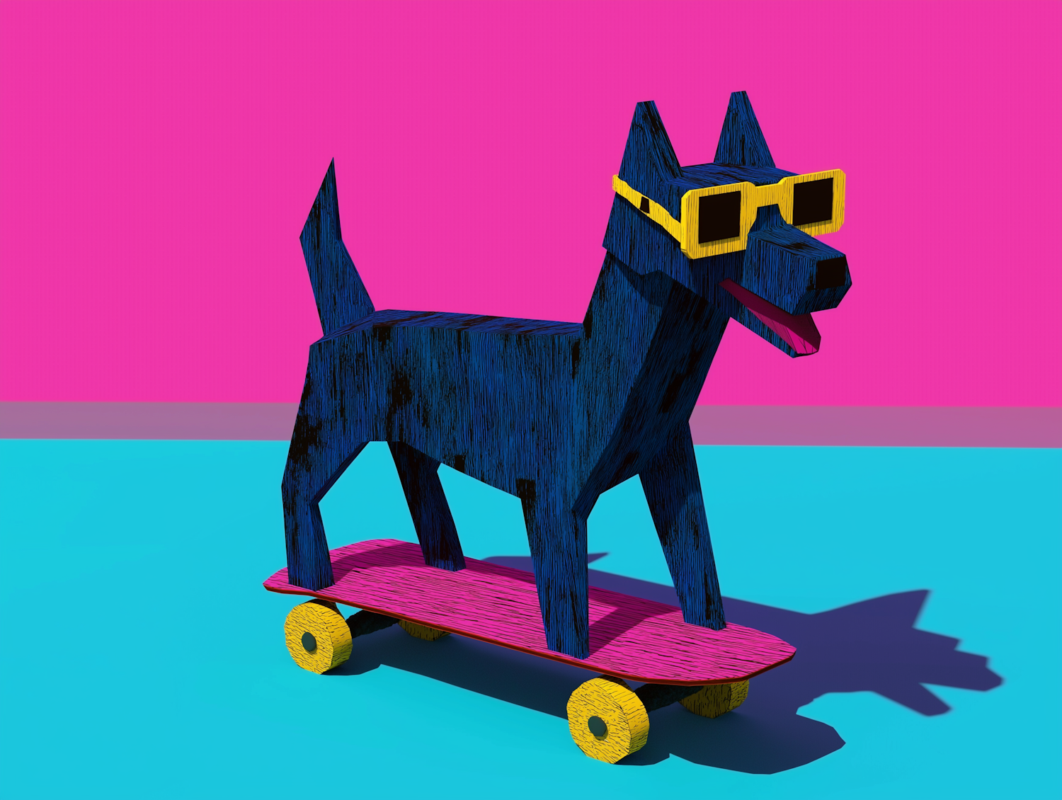 Geometric blue dog with yellow sunglasses on a pink skateboard against a vibrant pink and turquoise background.