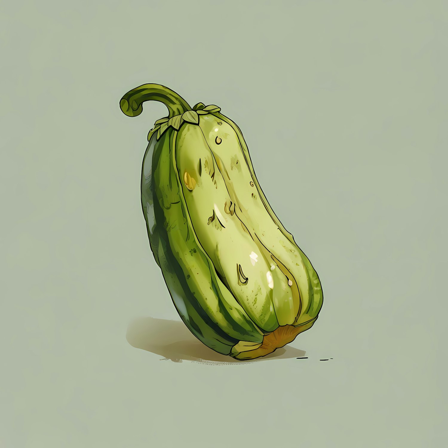 Stylized illustration of a glossy green bell pepper on a light green background, showcasing a playful and artistic design.
