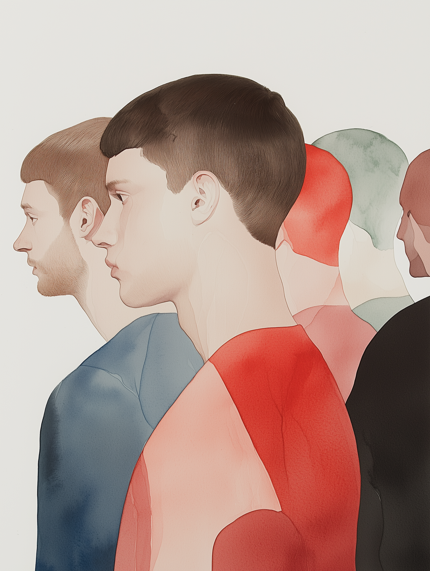 Stylized watercolor illustration of young men in profile, layered with muted tones and translucent effects for a minimalist, abstract vibe.