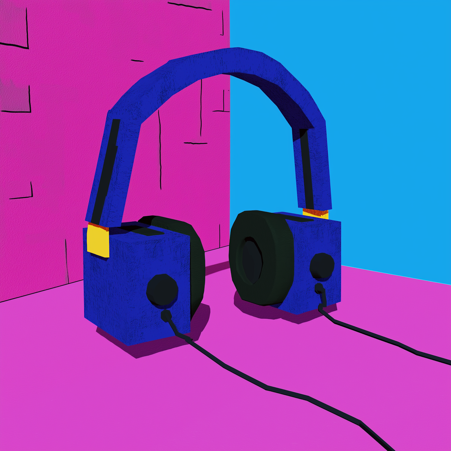 Stylized blue headphones with black ear pads and yellow accents against a vibrant pink and blue background.