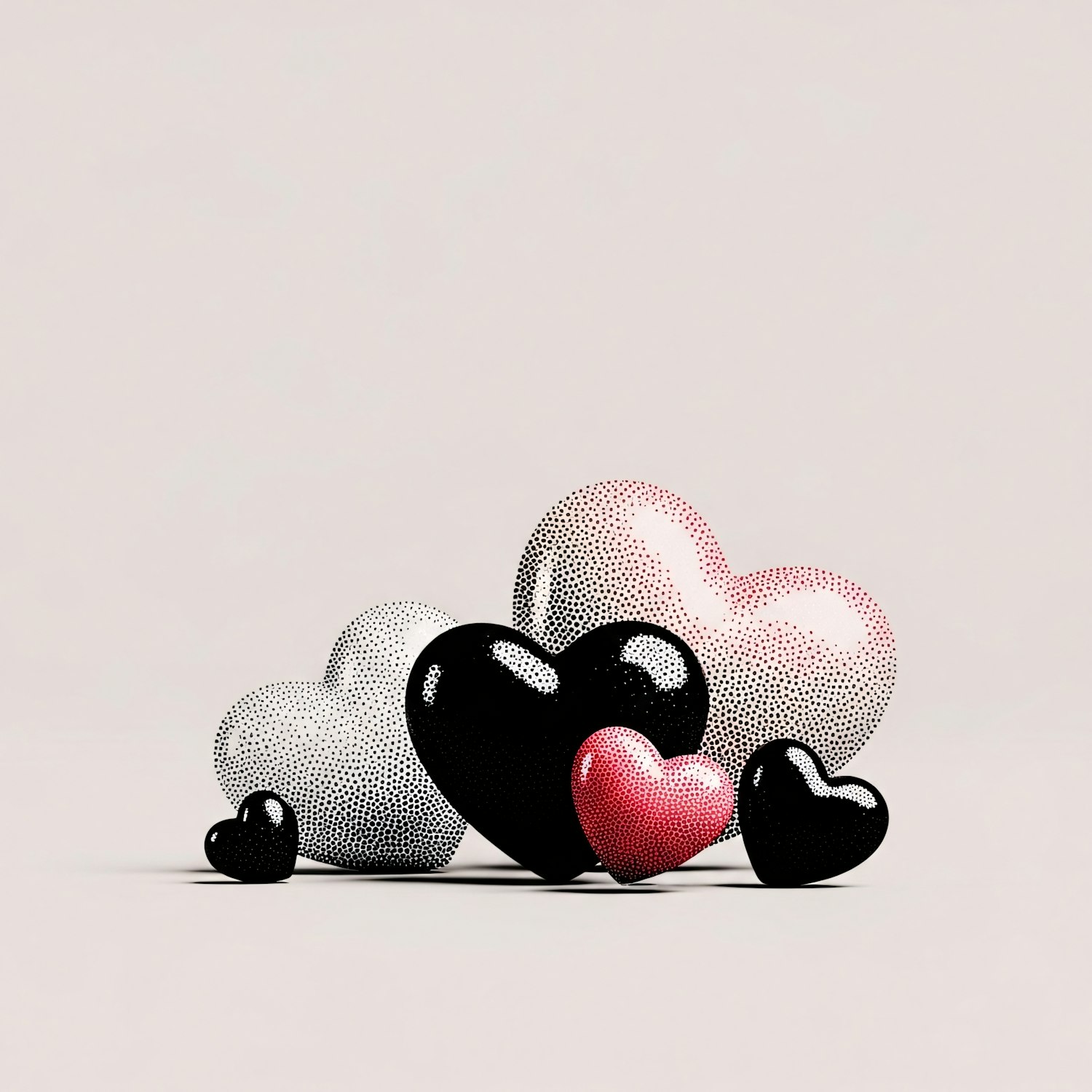Stylized glossy hearts in black, white, and pink with a dotted texture, arranged on a neutral background for a modern artistic look.