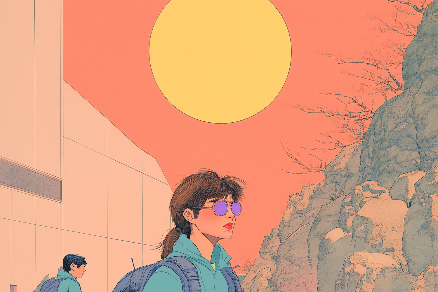 Stylized illustration of a woman with sunglasses and backpack under a large sun, set against a peach sky and rocky cliff.