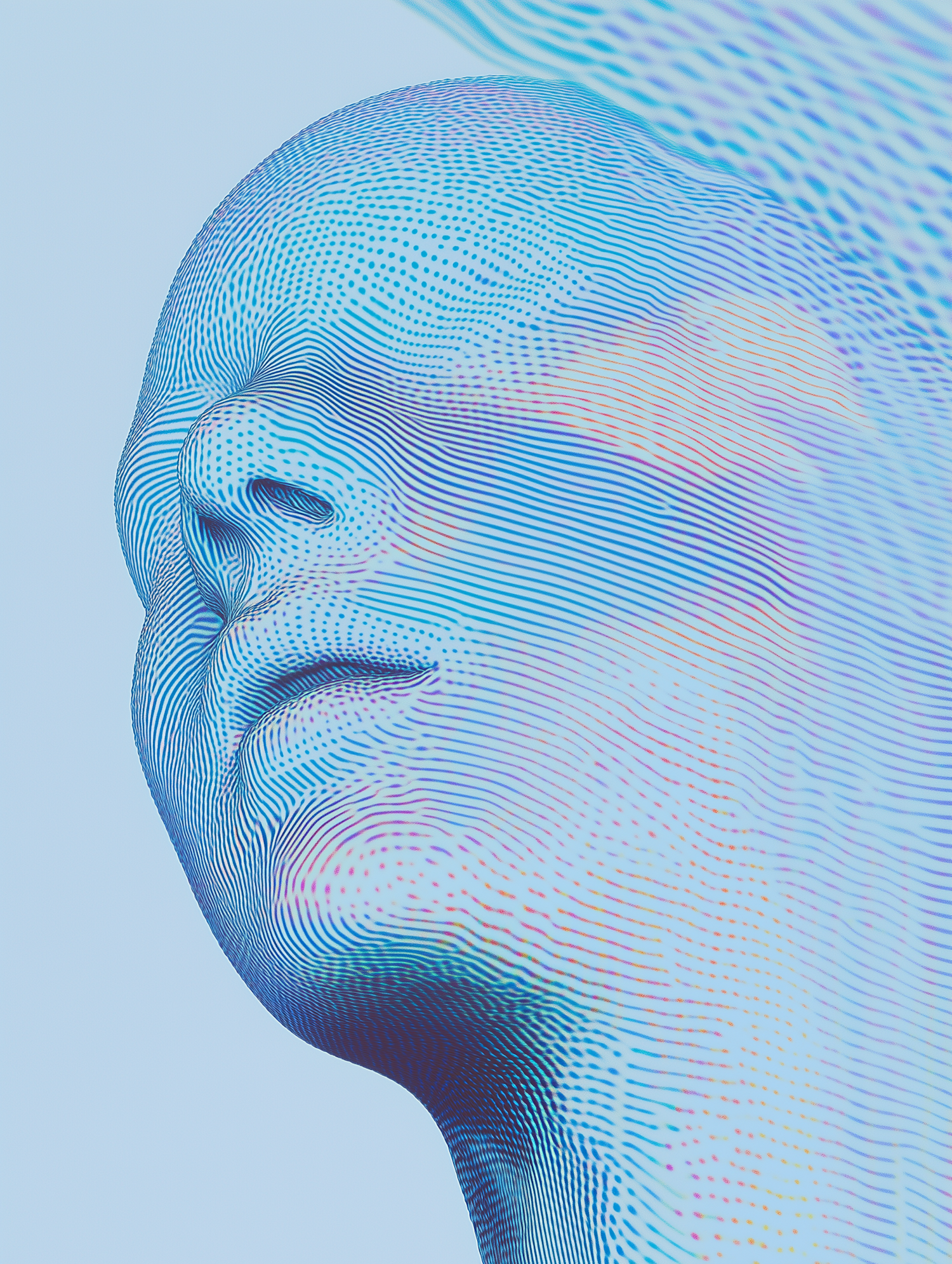 Abstract digital illustration of a human face with blue and purple lines, creating a serene and textured effect.
