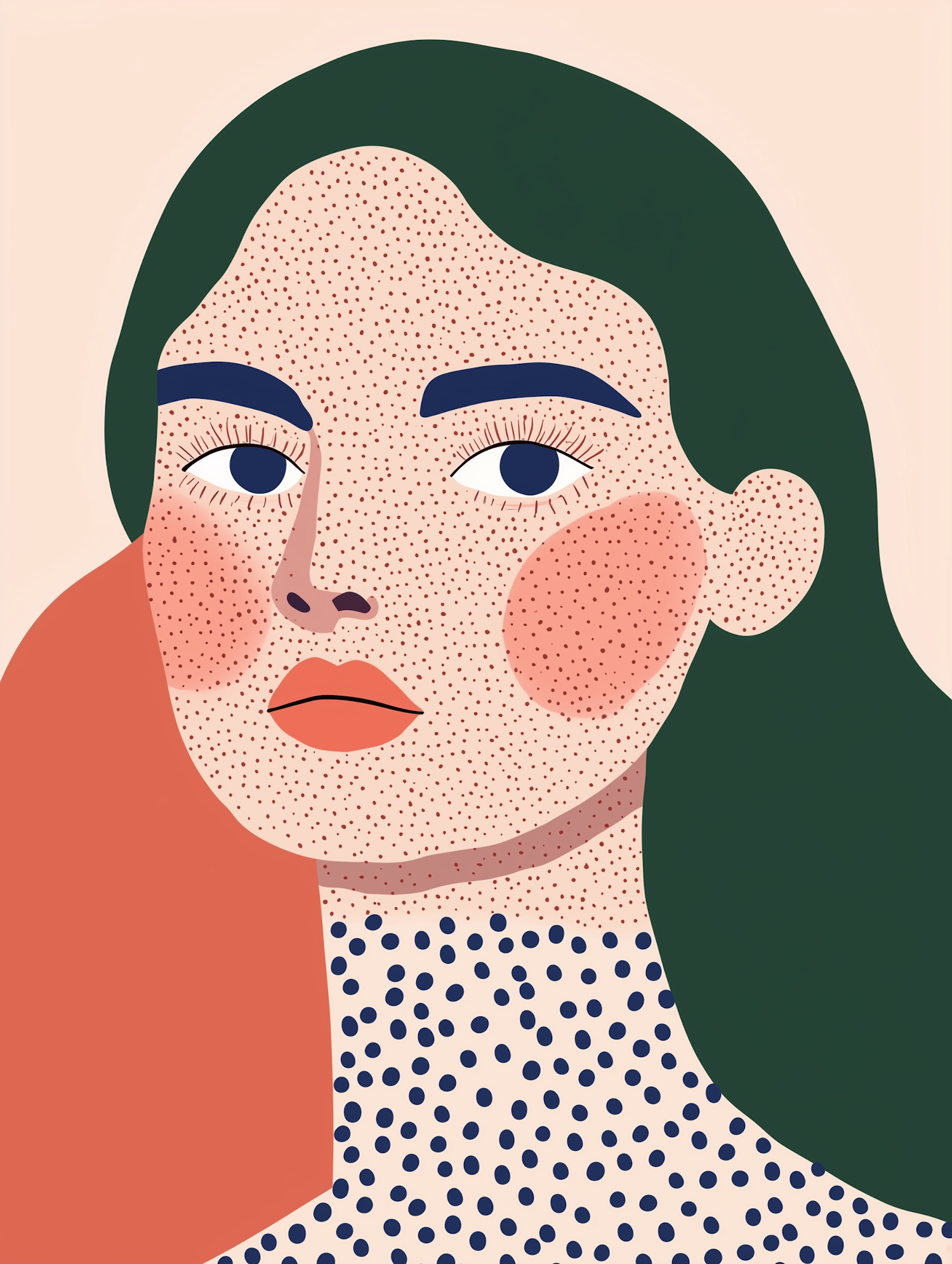 Abstract illustration of a woman with green hair, freckles, and polka dot clothing. Bold colors and modern design elements.