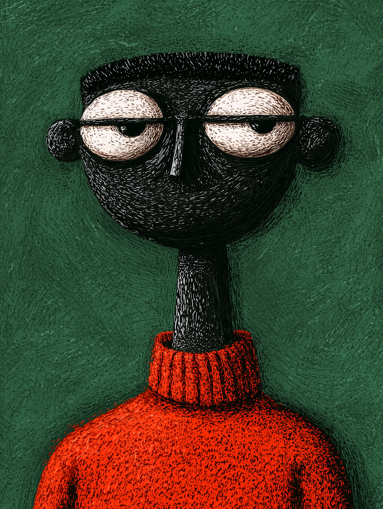 Stylized illustration of a character with a black face, large white eyes, red turtleneck, and textured green background.