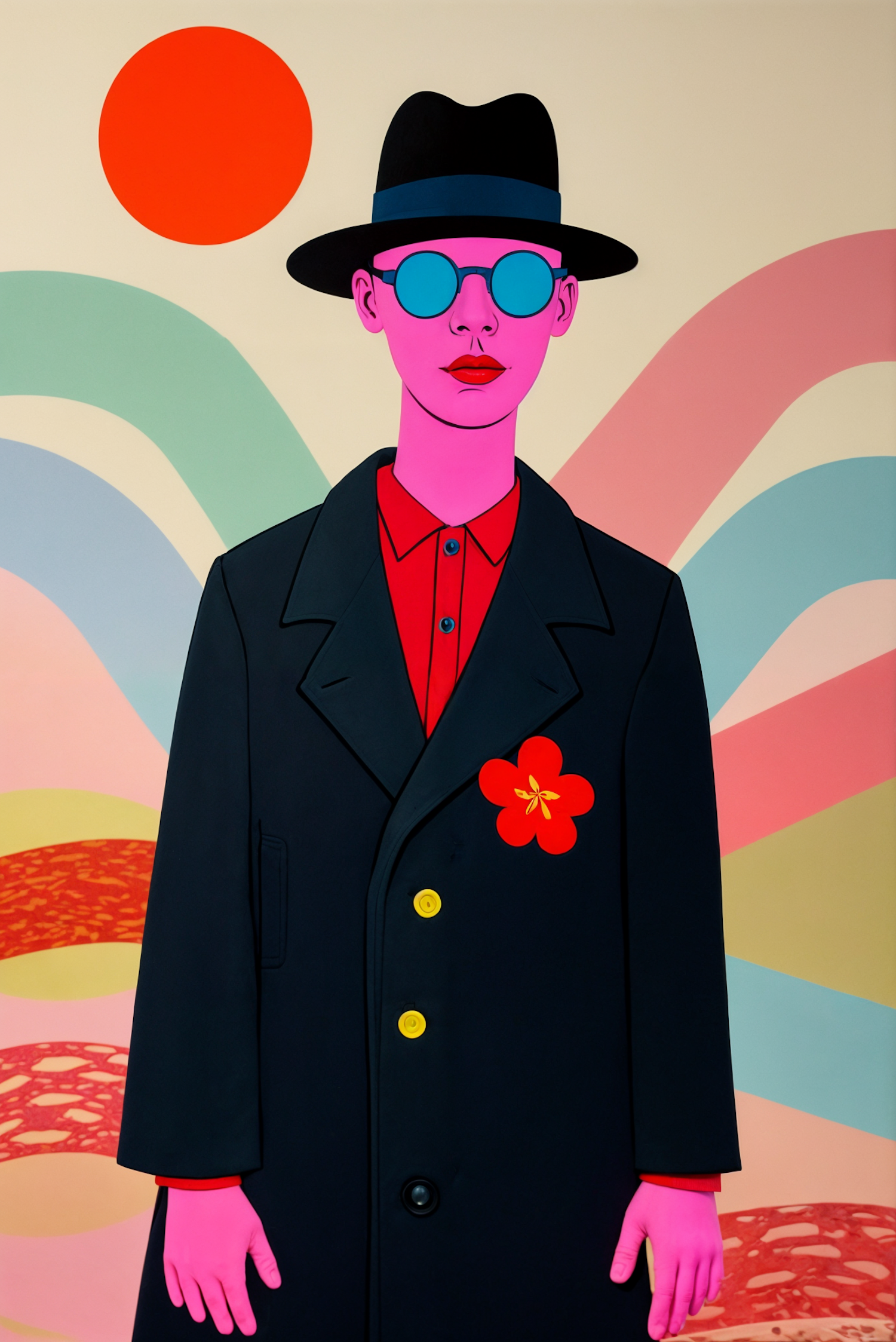 Vibrant illustration of a person with pink skin, black coat, and blue sunglasses against a colorful abstract background.