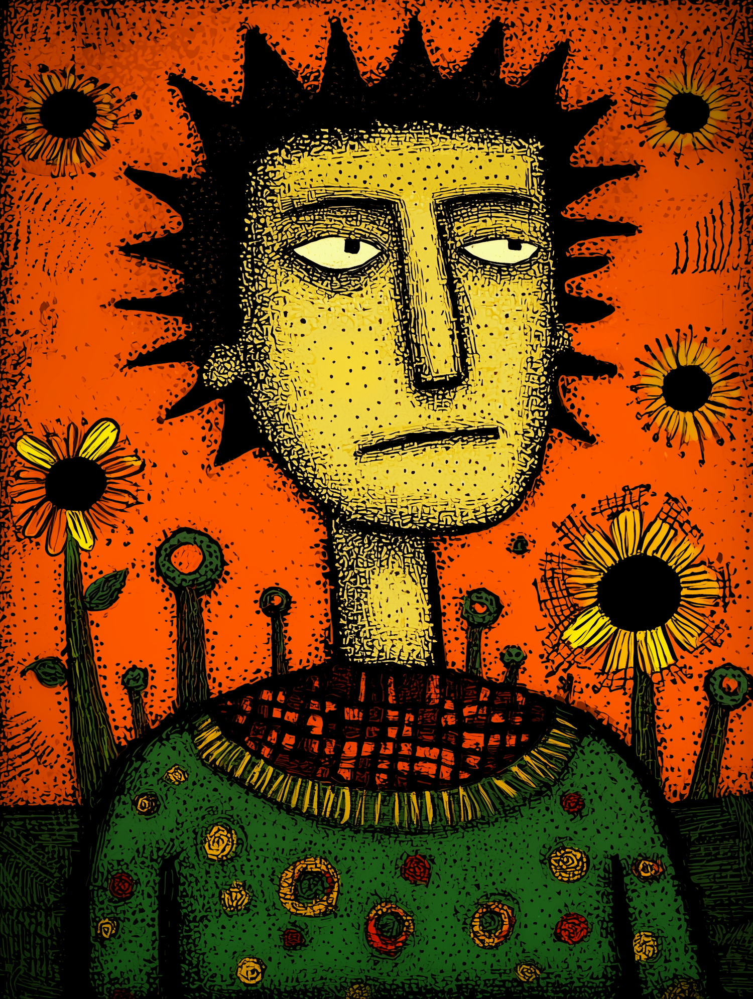 Stylized illustration of a person with spiky hair, wearing a green sweater, surrounded by sunflowers on an orange background.
