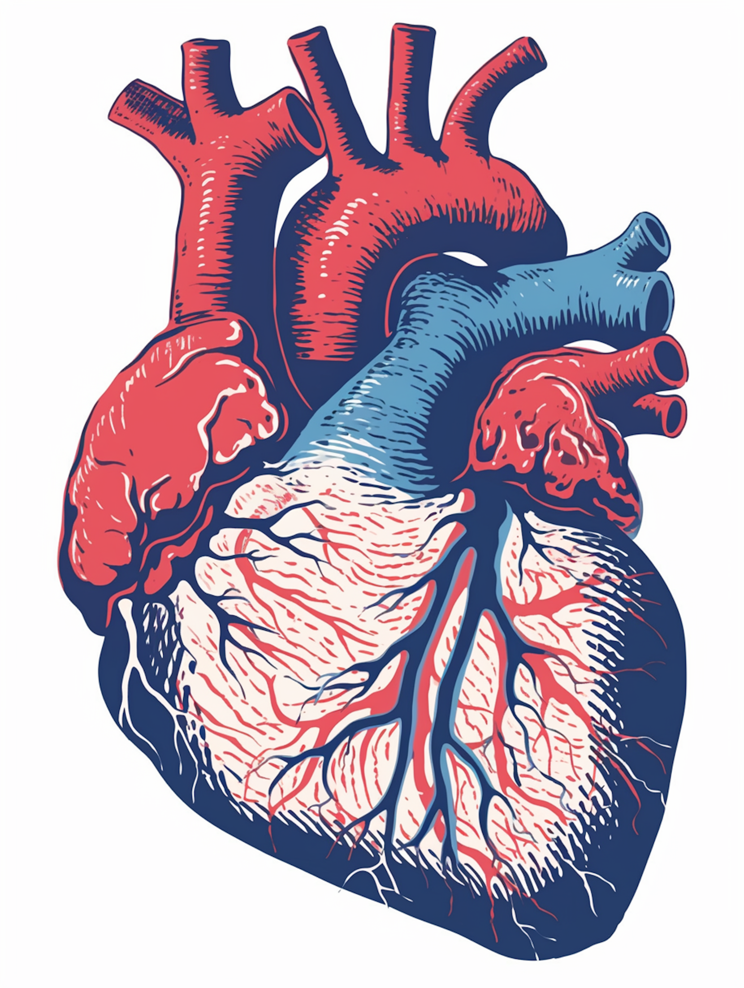 Stylized illustration of a human heart with vibrant red and blue colors, highlighting anatomical features and blood flow.