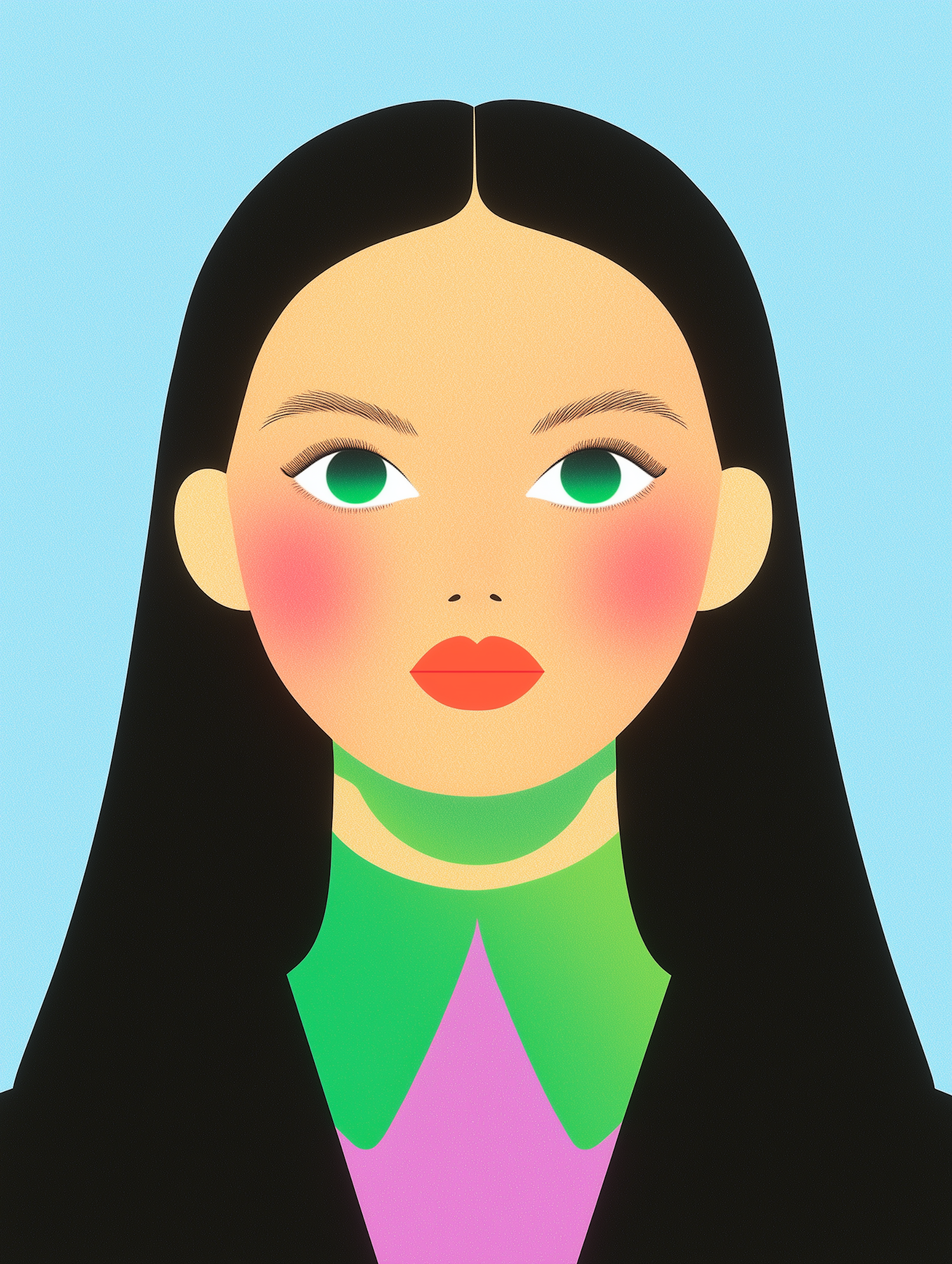 Stylized illustration of a woman with green eyes, black hair, and vibrant attire against a light blue background.