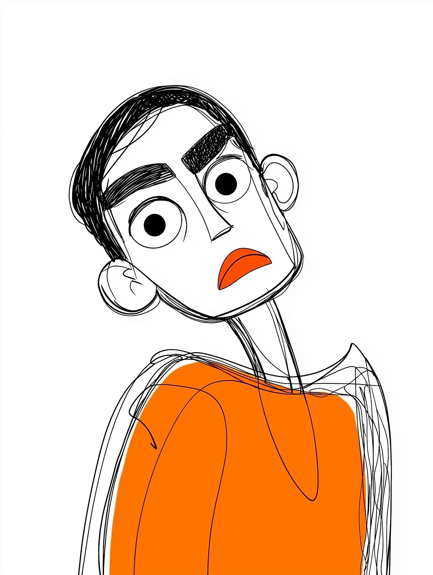 Stylized illustration of a surprised character with large eyes and an orange shirt, featuring bold lines and dynamic sketchy style.