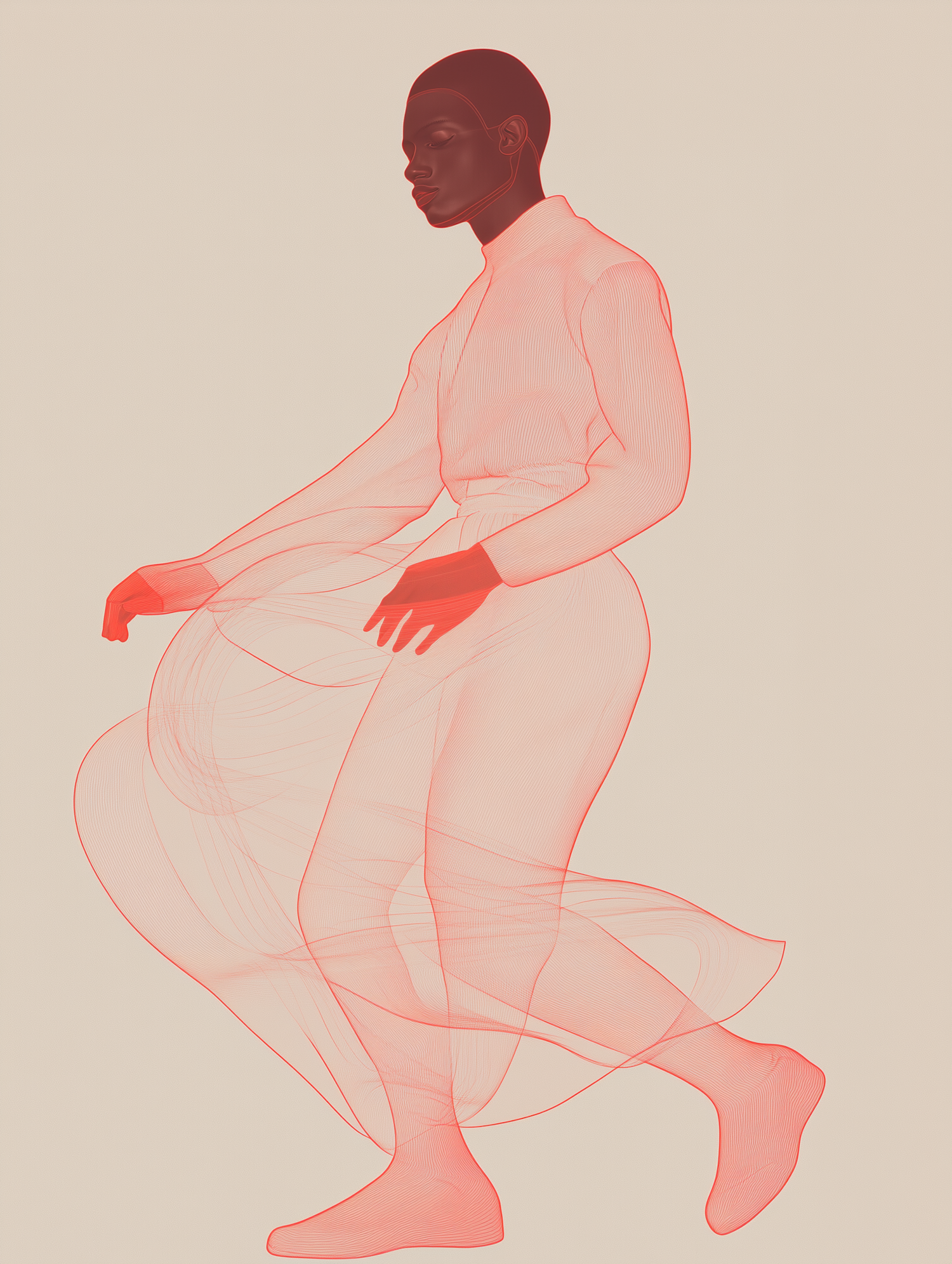 Stylized illustration of a Black individual in a flowing red-outlined garment on a beige background, exuding elegance and serenity.