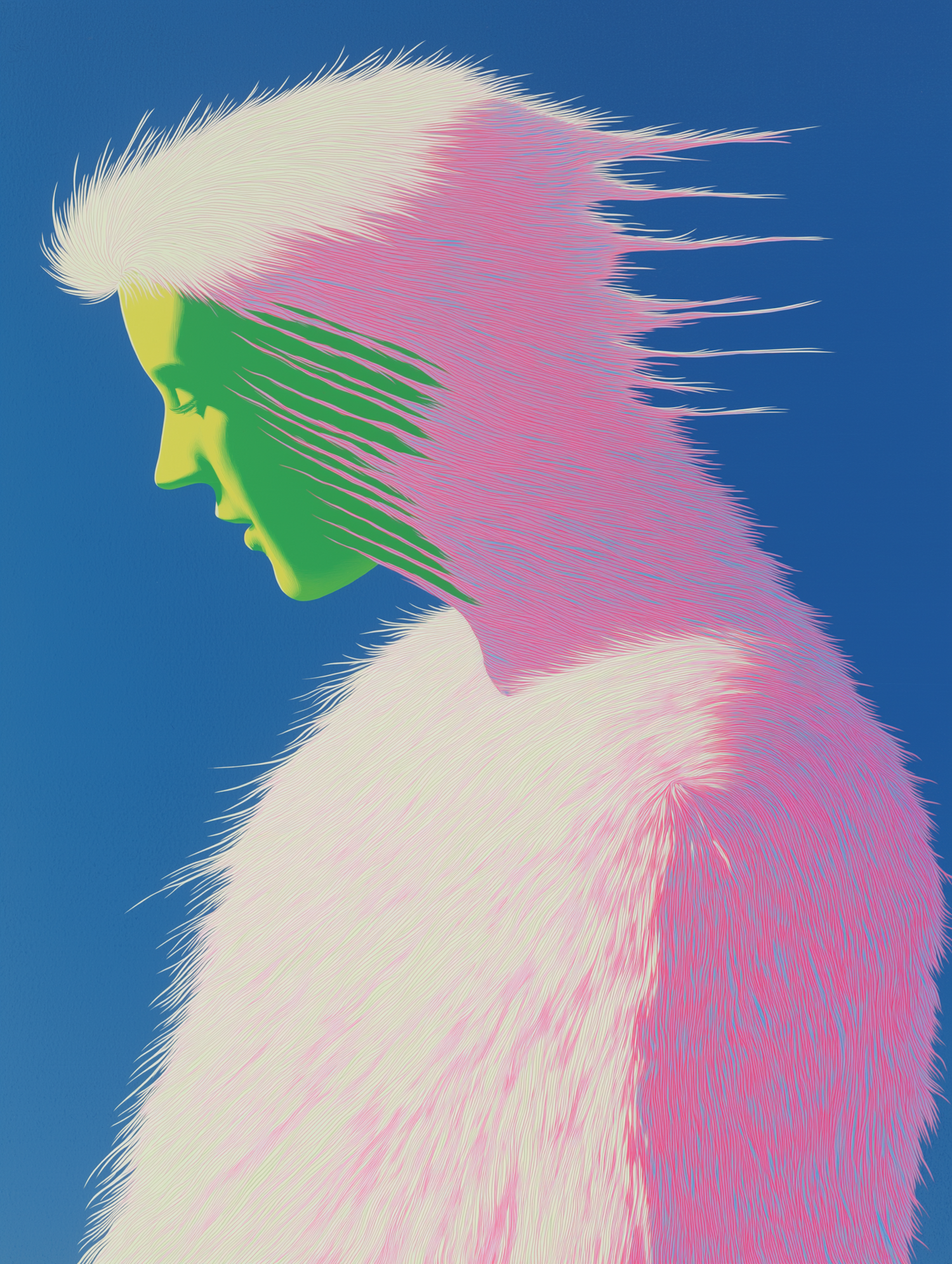 Surreal illustration of a green-faced figure with pink and white fur-like hair against a vivid blue background.
