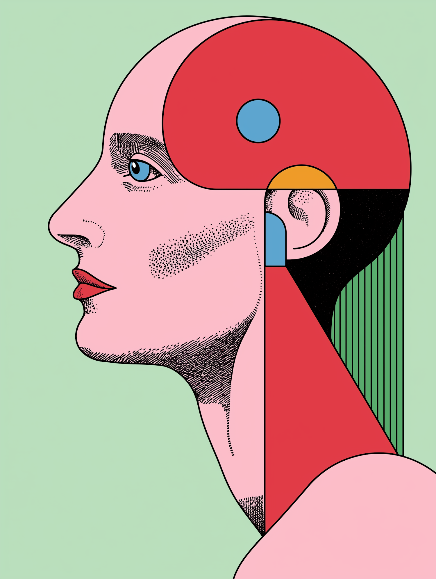 Abstract profile illustration with geometric shapes, bold colors, and a pastel green background, blending minimalism and surrealism.