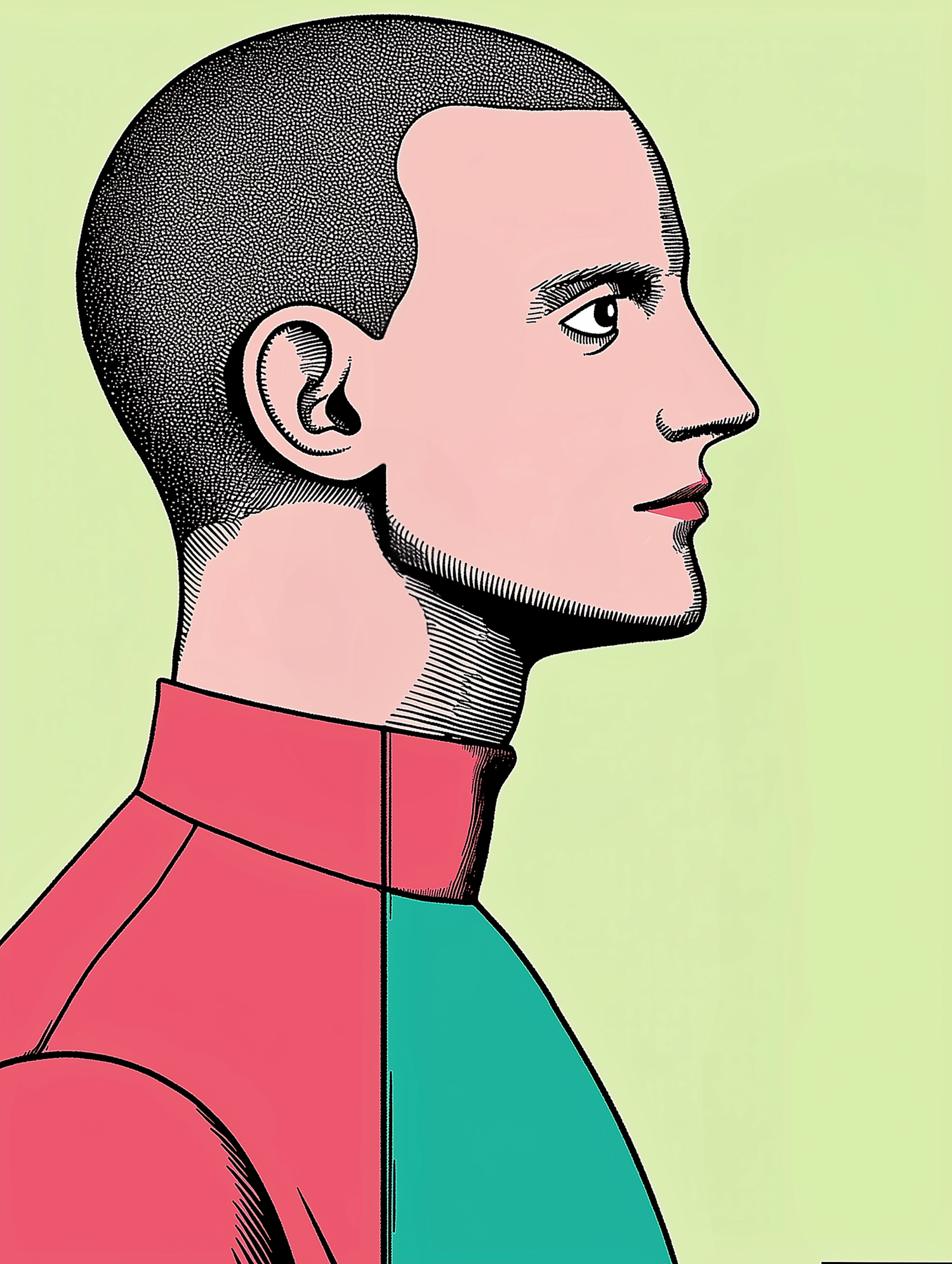 Stylized profile illustration with bold lines and dual-colored attire against a light green background.