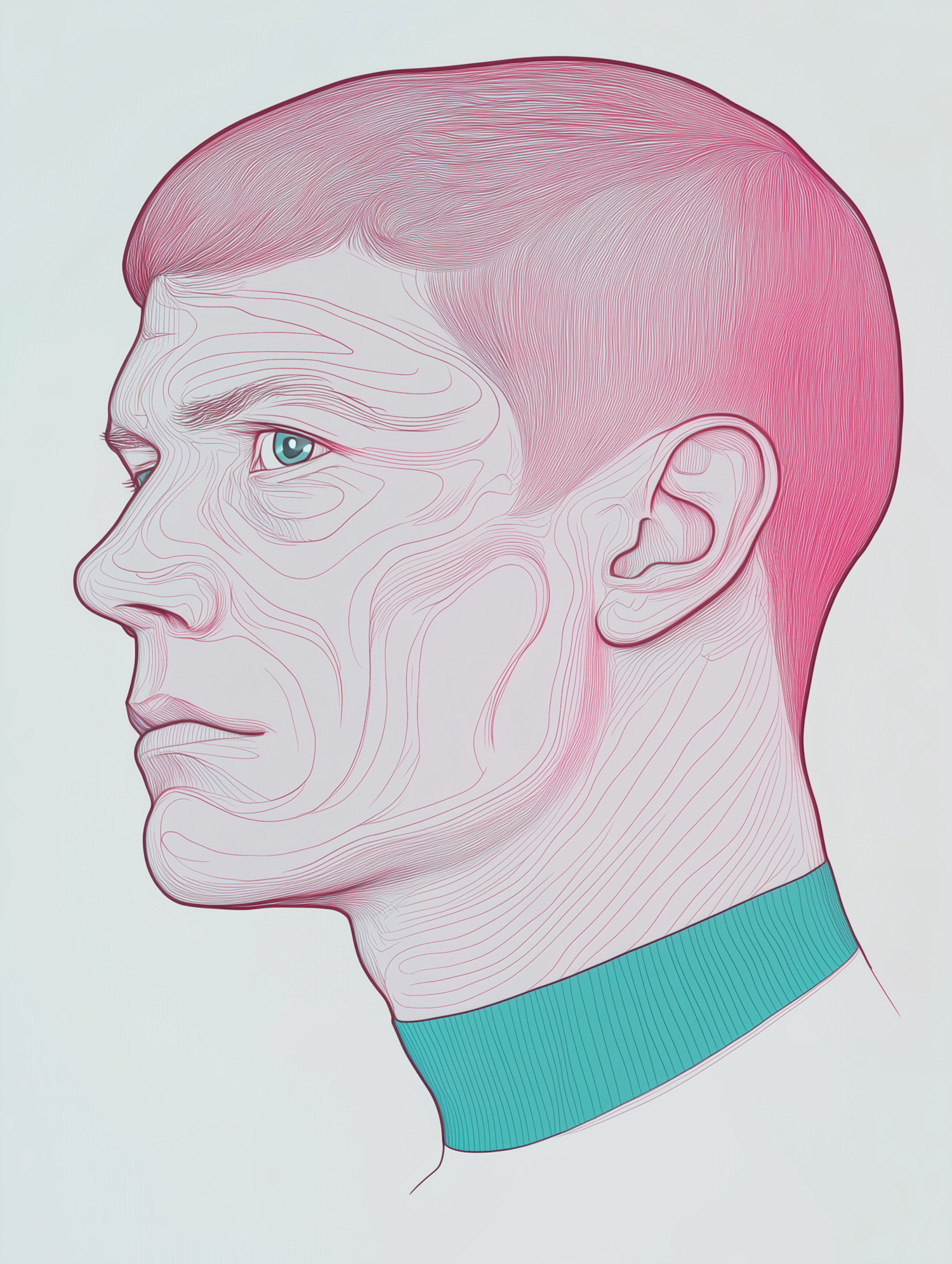 Stylized profile illustration of a man with pink hair and blue eyes, featuring intricate line work and a teal collar.