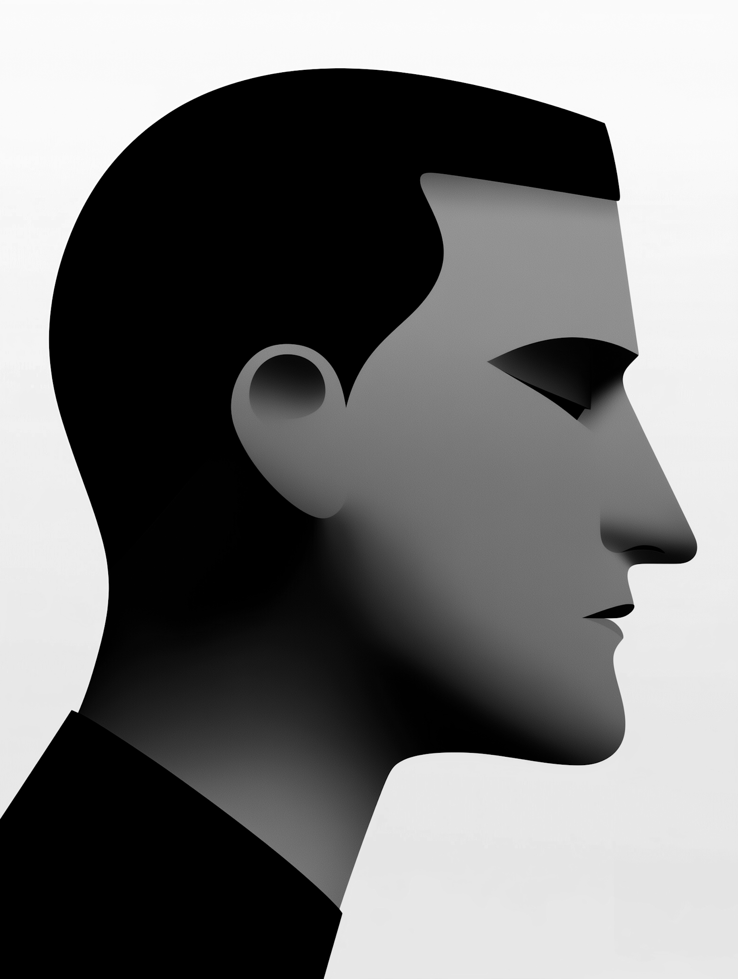 Minimalist grayscale profile illustration with geometric design and smooth gradients, emphasizing clean lines and modern style.