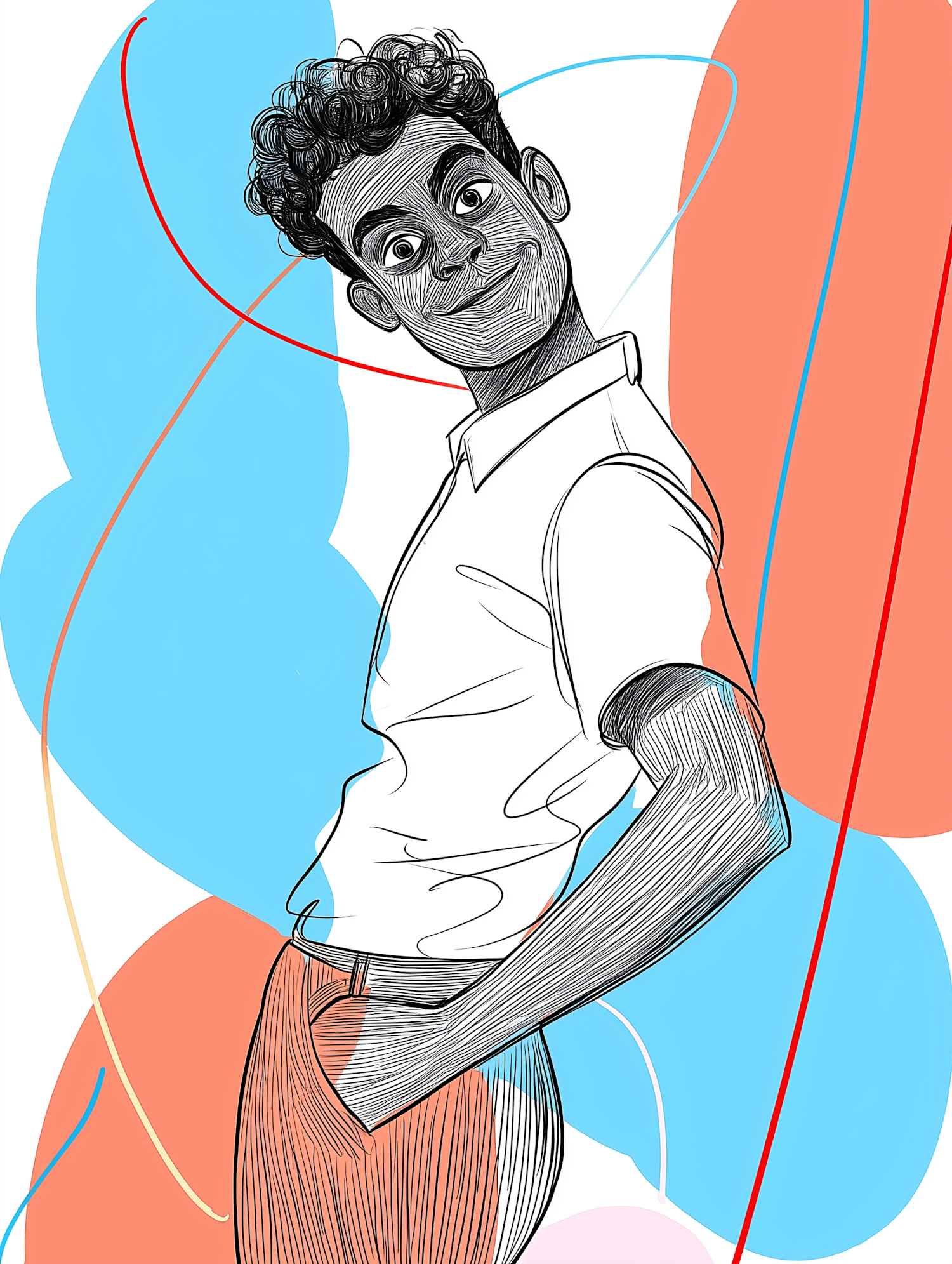 Vibrant illustration of a cheerful young man with curly hair, wearing a white shirt and red pants, set against an abstract colorful background.
