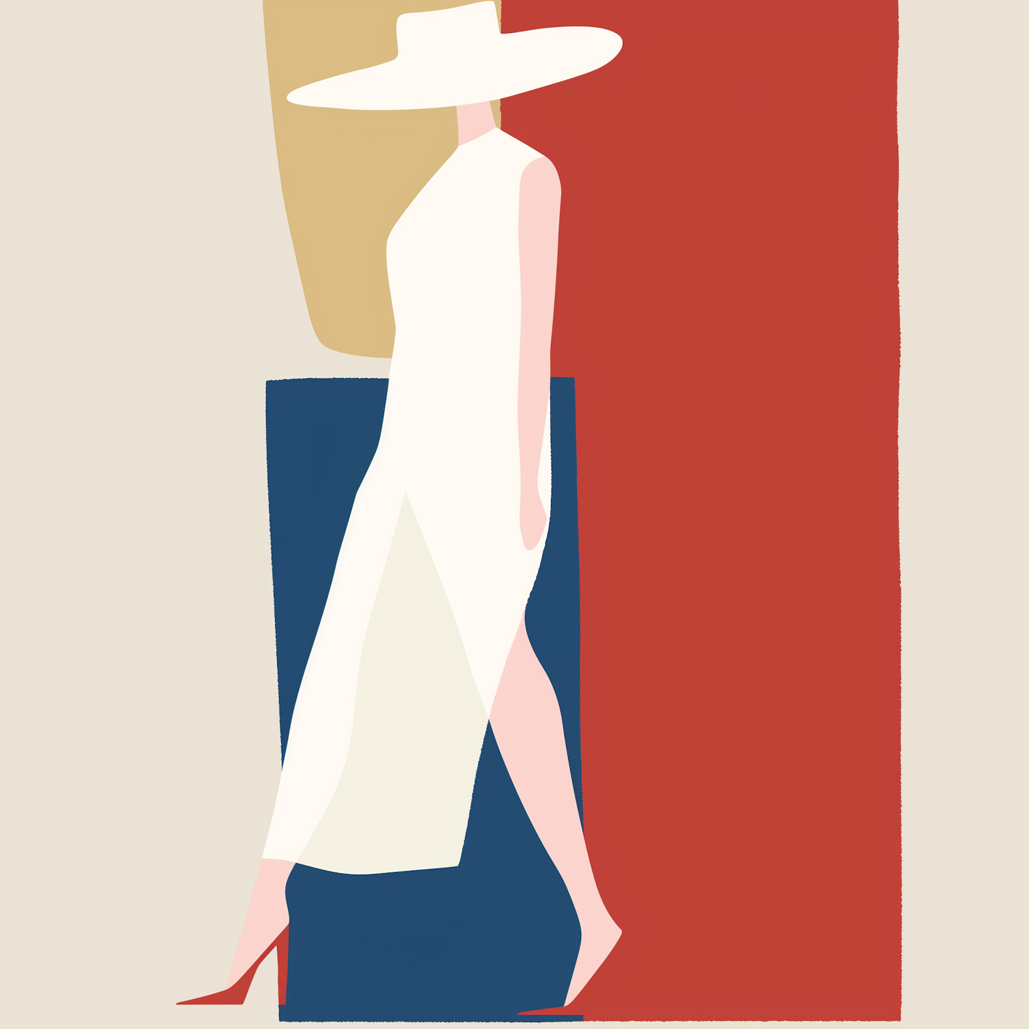 Minimalist illustration of a woman in a white dress and hat, walking with red heels against bold geometric color blocks.
